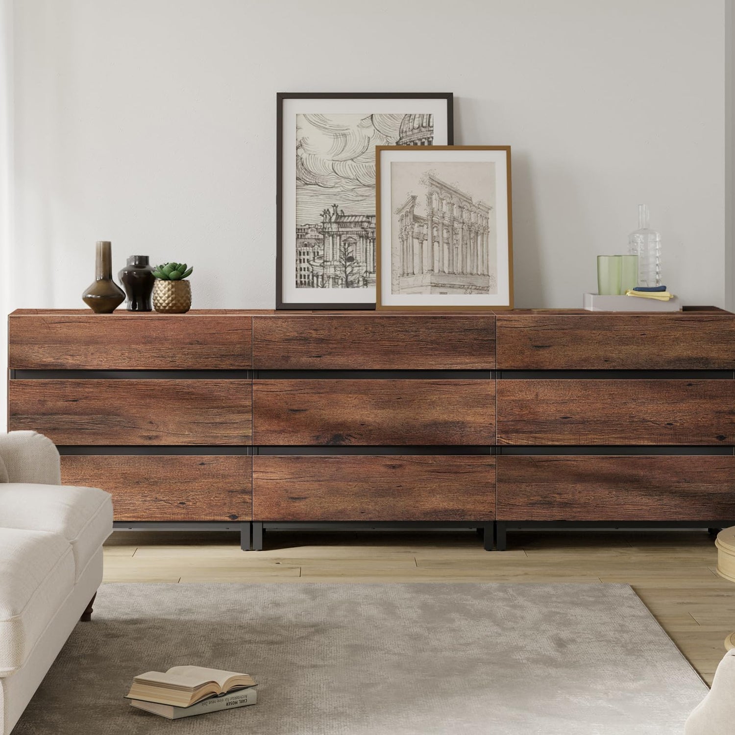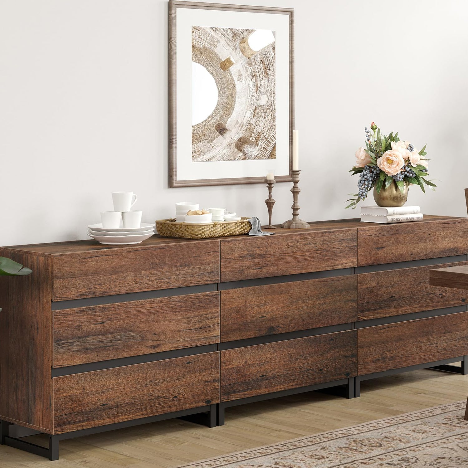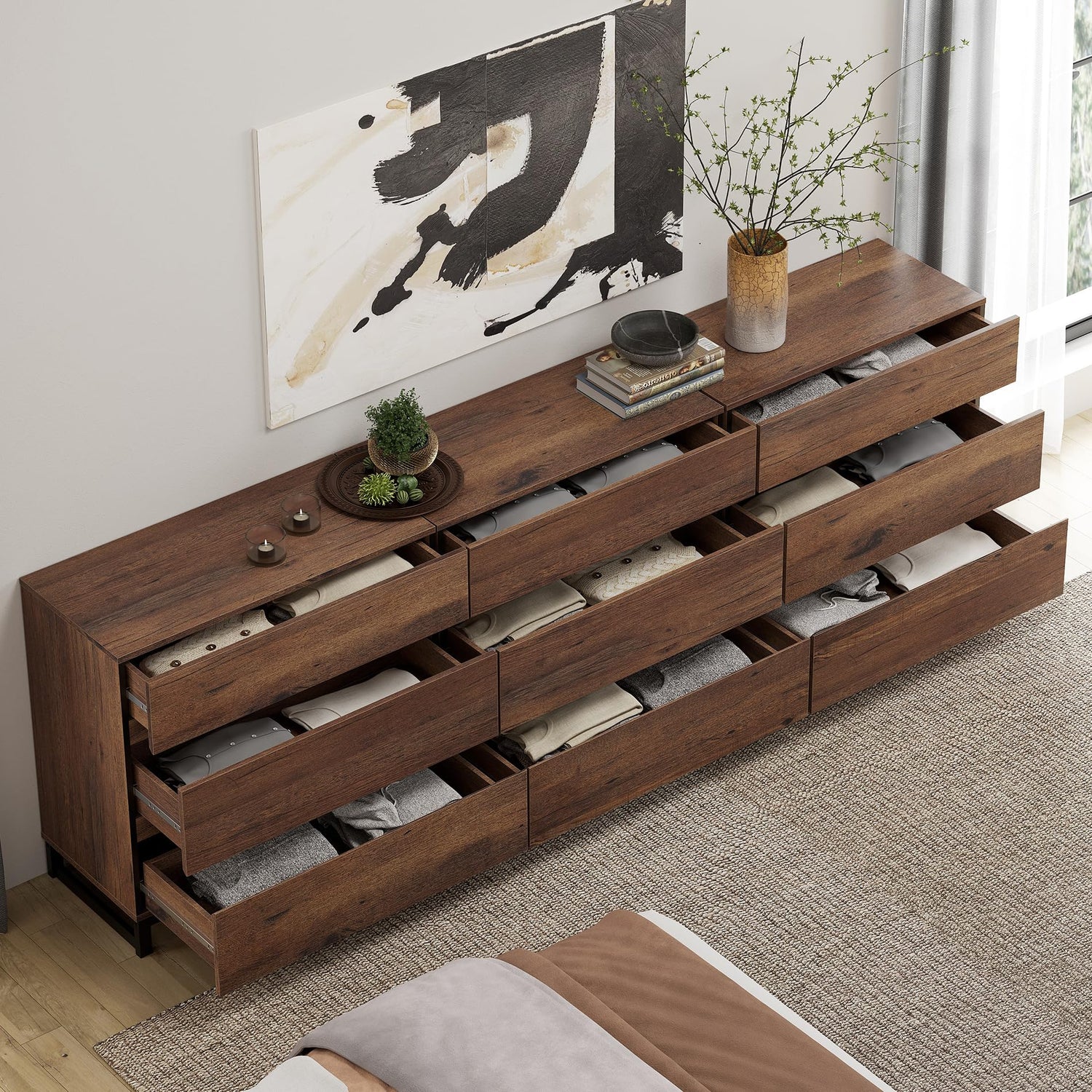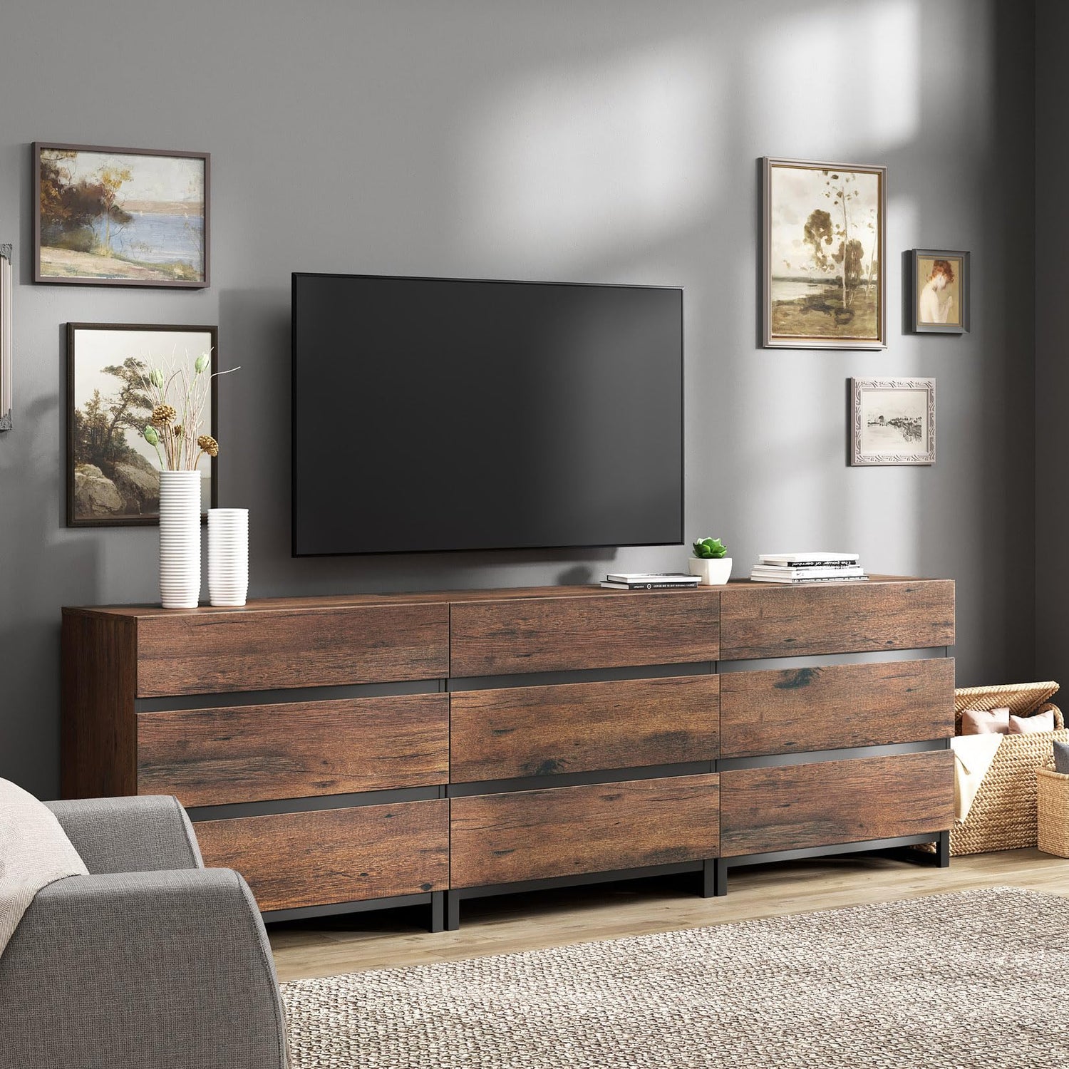 - 【Spacious Storage Space】This 9 drawer dresser has ample storage space that allows you to keep your living room neat and tidy. Boasting six spacious drawers, it provides plenty of room to store everything from your remote controls, DVDs, gaming consoles, to other miscellaneous items. Each drawer glides smoothly, ensuring easy access to your items.