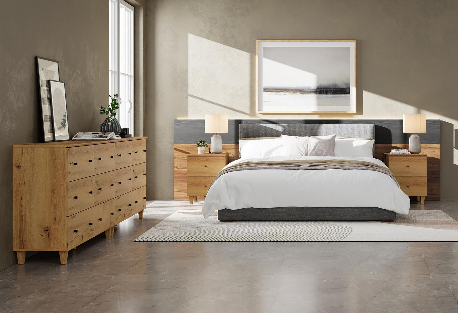- Modern Design 2-In-1 Dresser and 2 Pieces Nightstand Set: This Bedroom Furniture set includes 2 wooden dressers and set of 2 bedside tables. With classic black pull knobs. The oak brown wood finish paired with smooth finish solid legs combines modern elegance to add character and charm to your bedroom and living room. Overall dimension for each dresser: 47.2"W x 15.3"D x 32.4"H, nightstand: 17.7"W x 15.3"D x 23"H