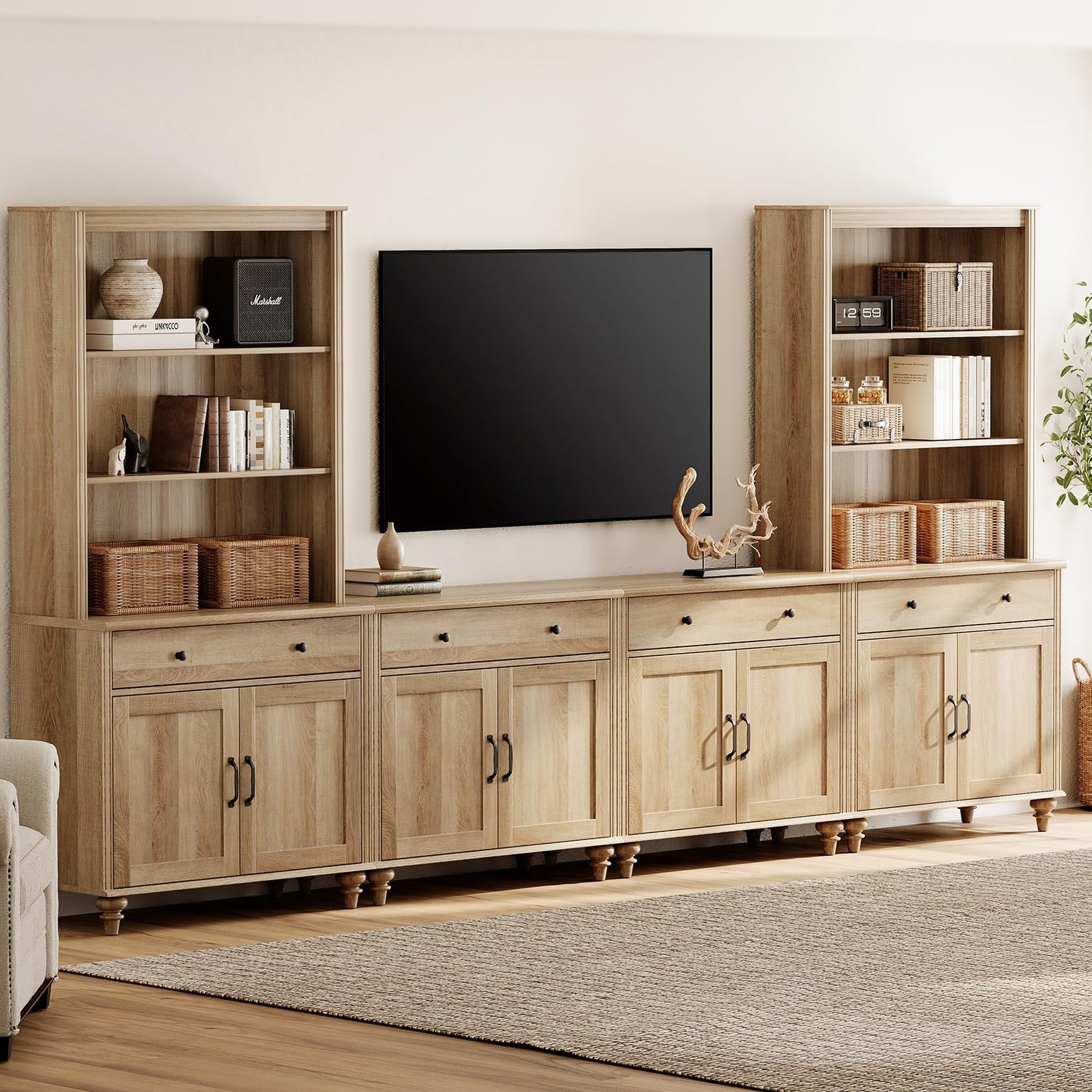 - 【Meet All Your Storage Needs】This wall unit tv stand comes with 4 cabinets, 2 bookcases.There are total 14 open shelves, 8 Doors and 4 drawers. Feature big double door storage cabinets with shelves accommodating various items, including large TVs and entertainment devices.The tv console allows you to keep your belongings organized and within reach.Wide 68 inch tabletop, perfect for your 75 inch tv stand.
