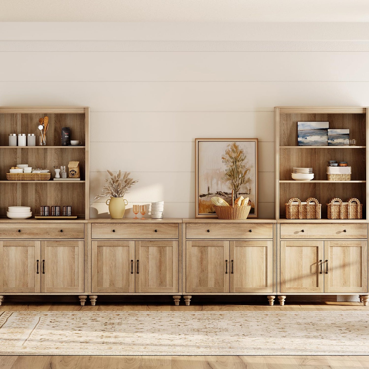 - 【All in One Design TV Stand】Multifunctional use of cabinet space. TV cabinet, bookshelf, wine cabinet, display cabinet,dresser are all in one, solving your matching worries.creating own style of exquisite life.Kindly be aware: The oak tv cabinet is dispatched in 4 separate packages, which might arrive on different days.Overall size: 135.4”W x 72.1”D x 15.7”H.