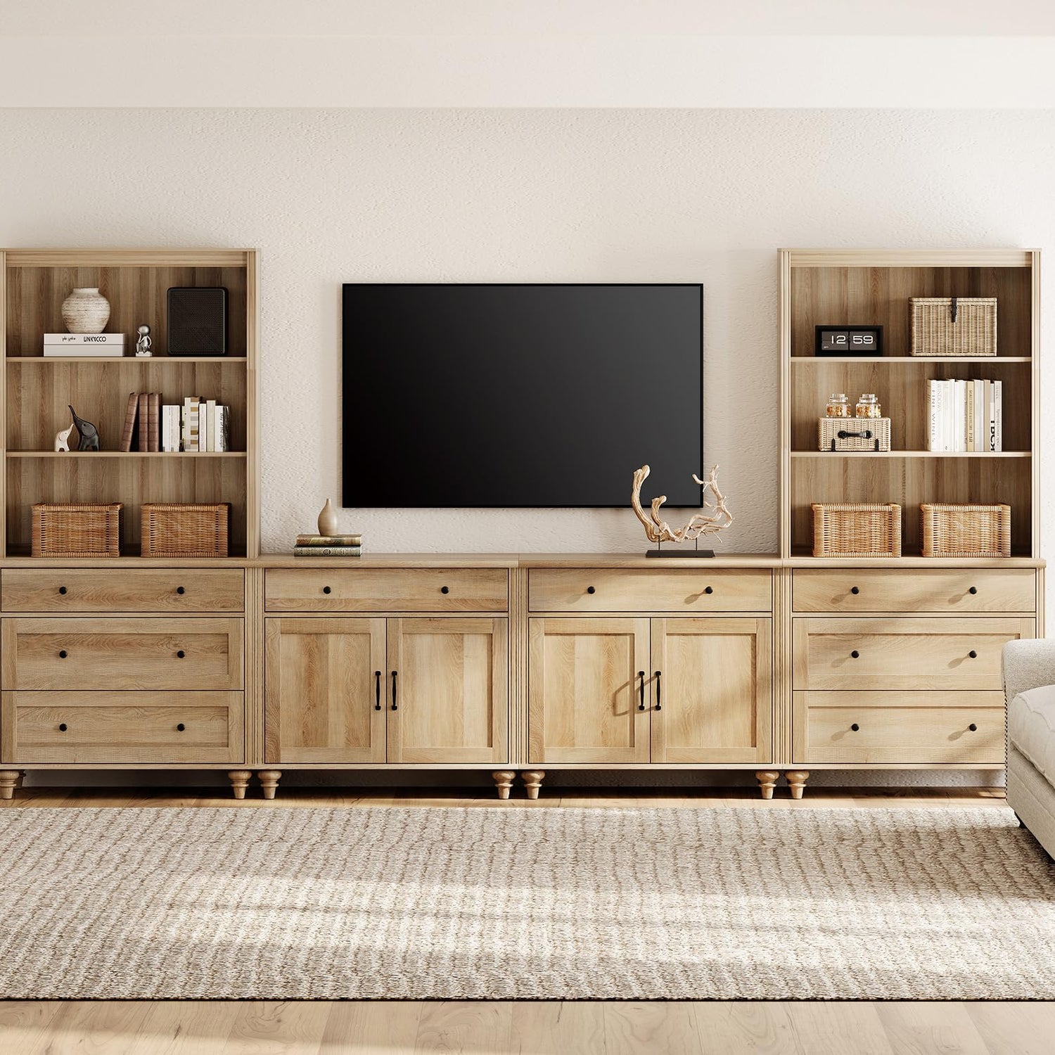 - 【Meet All Your Storage Needs】This wall unit tv stand comes with 2 cabinets, 2 bookcases and 2 dressers.There are total 10 open shelves and 8 drawers. Feature 2 big double door storage cabinets with 4 shelves accommodating various items, including large TVs and entertainment devices.The tv console allows you to keep your belongings organized and within reach.Wide 68 inch tabletop, perfect for your 75 inch tv stand.