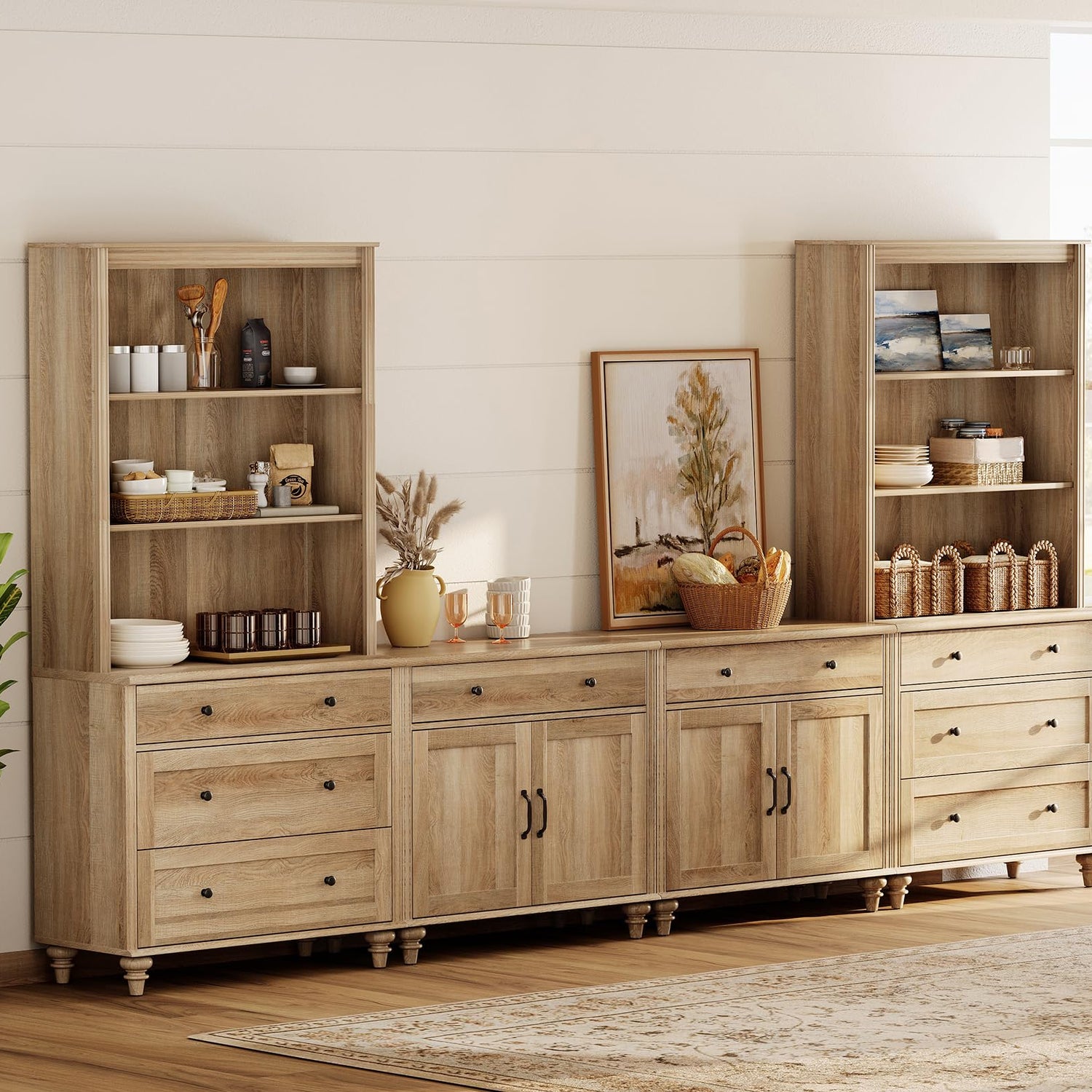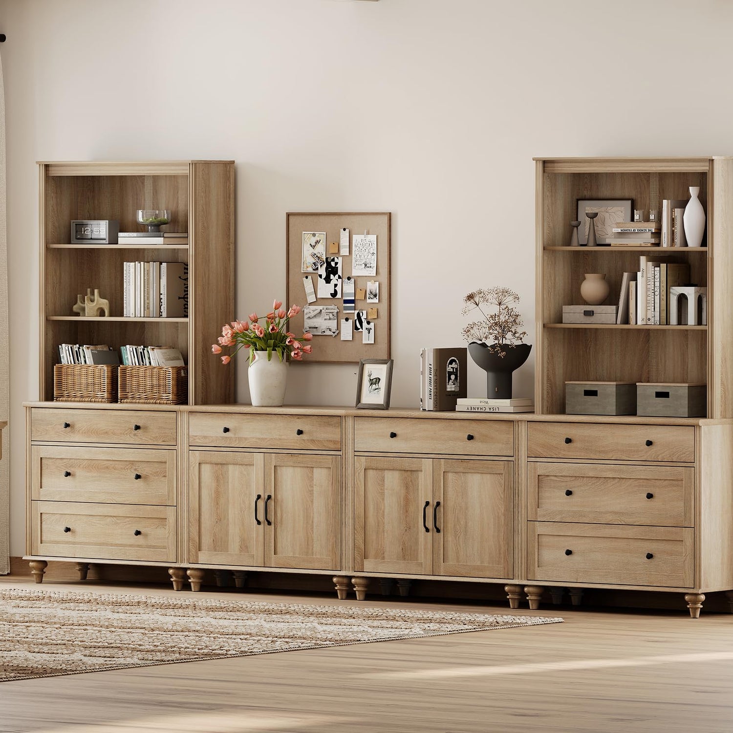 - 【All in One Design TV Stand】Multifunctional use of cabinet space. TV cabinet, bookshelf, wine cabinet, dresser are all in one, solving your matching worries.creating own style of exquisite life.Kindly be aware: The oak tv cabinet is dispatched in 5 separate packages, which might arrive on different days.Overall size: 135.4”W x 72.1”D x 15.7”H.