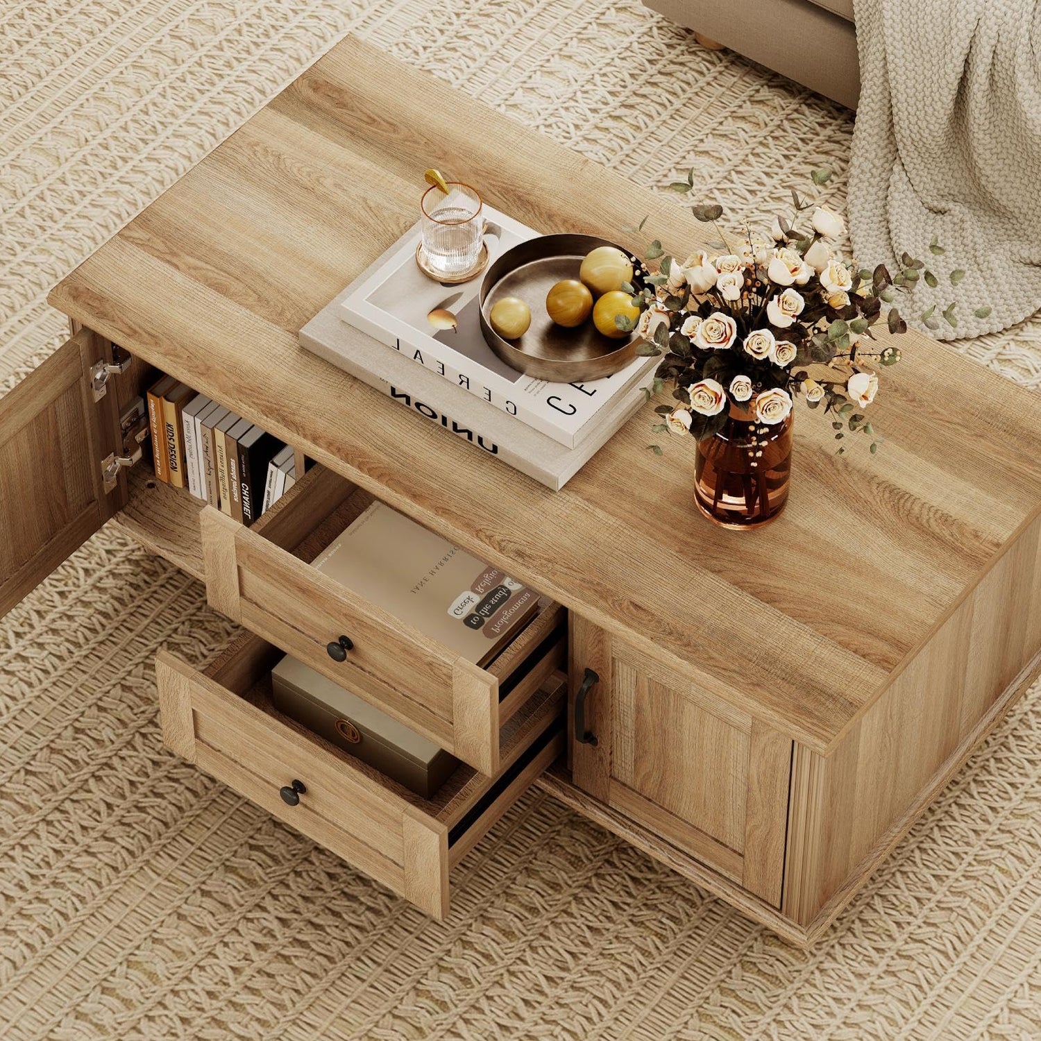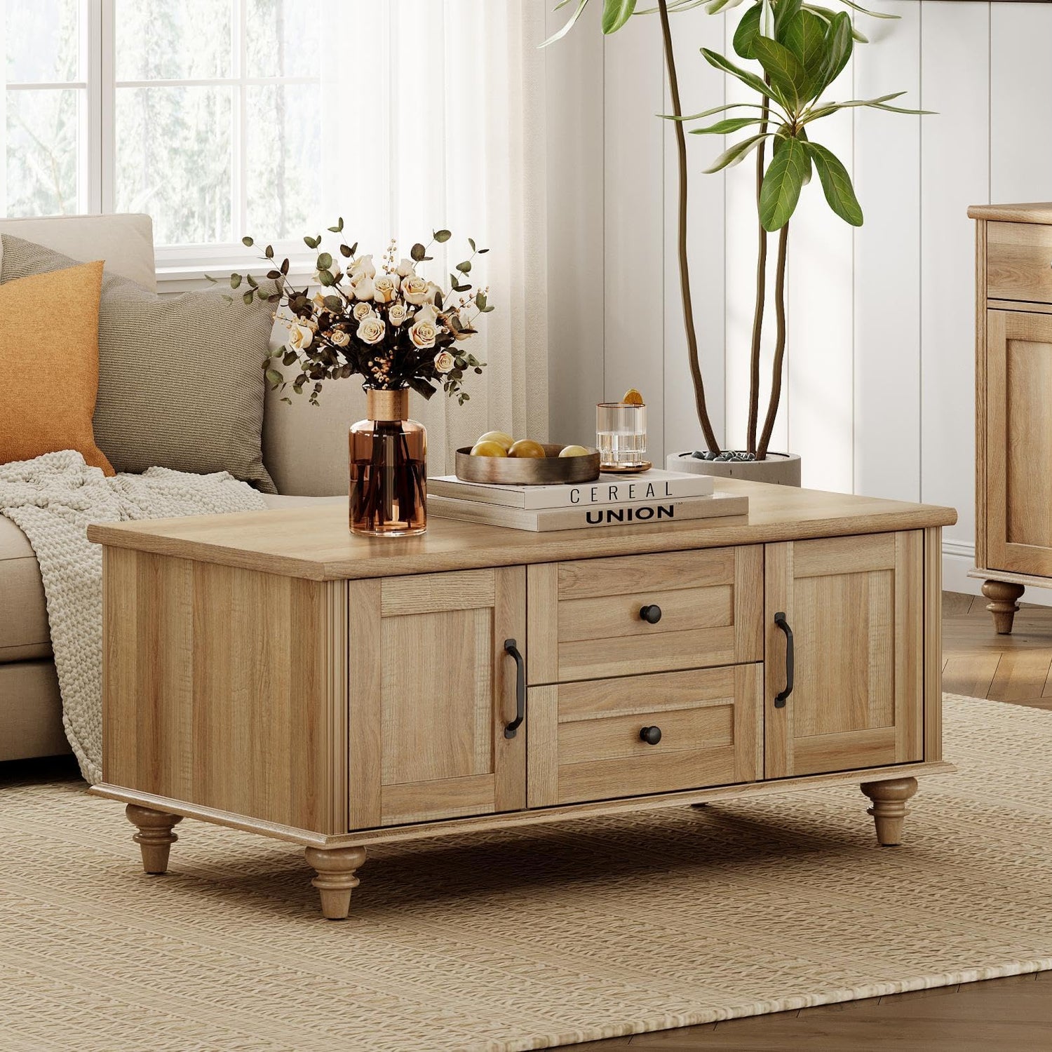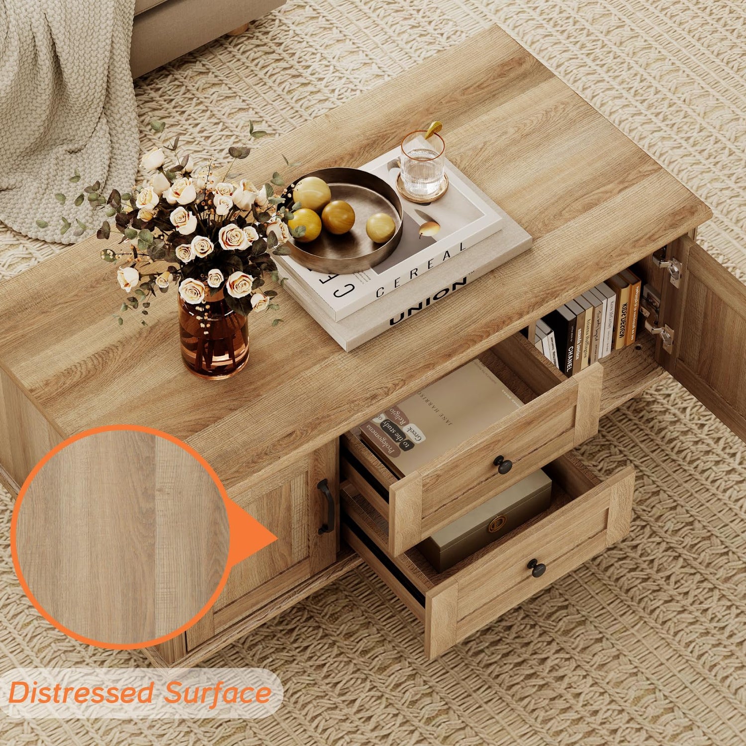 WAMPAT Farmhouse Coffee Table with Storage Cabinet, Wooden Coffee Tables for Living Room, Rustic Tea Table Rectangle Center Table with Drawers for Home, Oak