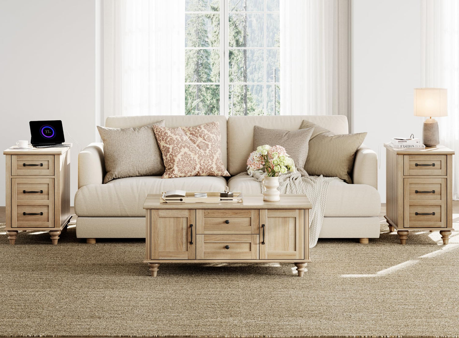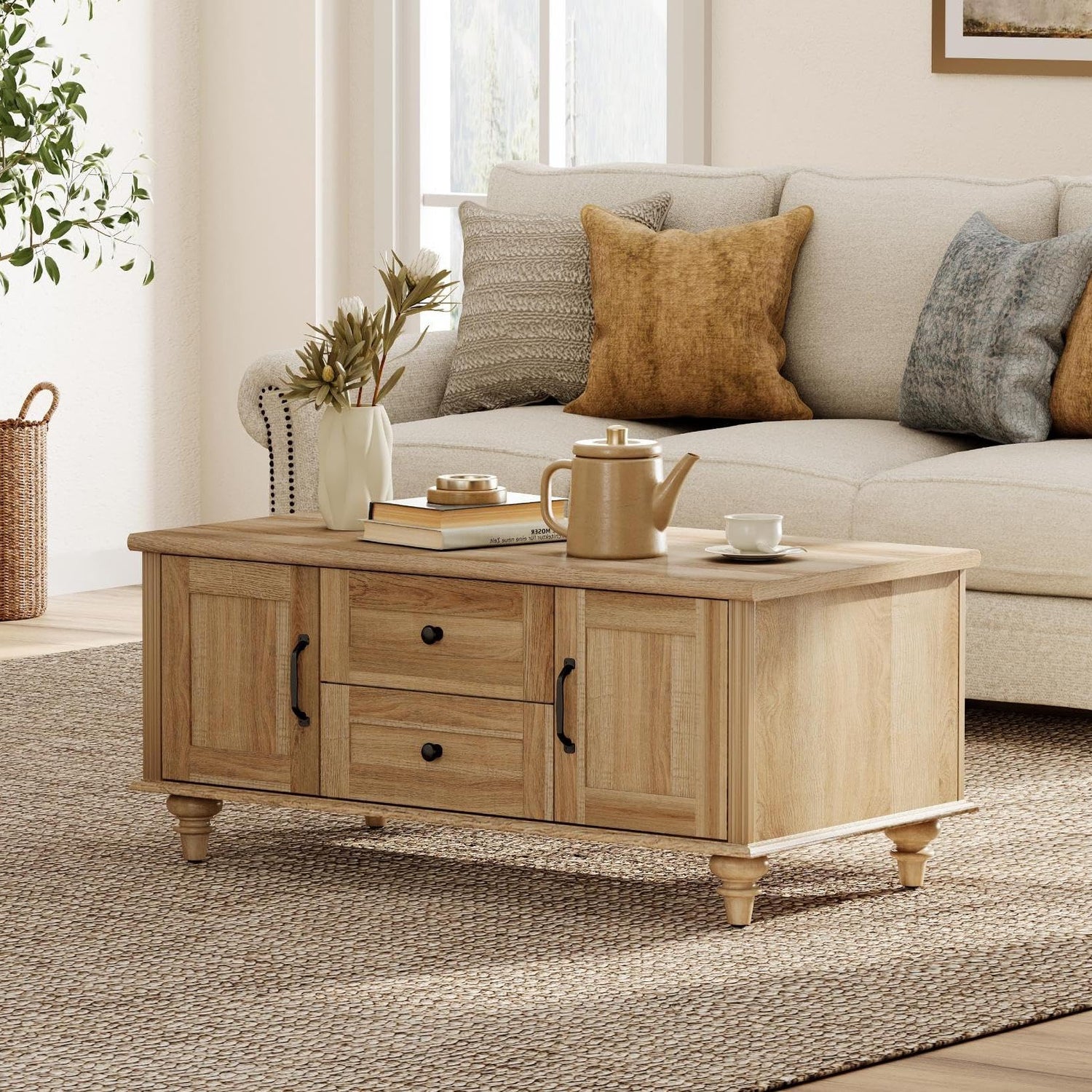 - 【Stable and Durable Structure】Made from thickened premium P2 MDF, the farmhouse coffee table offers long life span. Plus, gourd-shaped solid wood legs make sure the stability of the coffee table for living room. The rounded table edge prevents accidental bruises. Weight Capacity of Tabletop: 88 lbs. Weight Capacity of Drawer: 11 lbs.