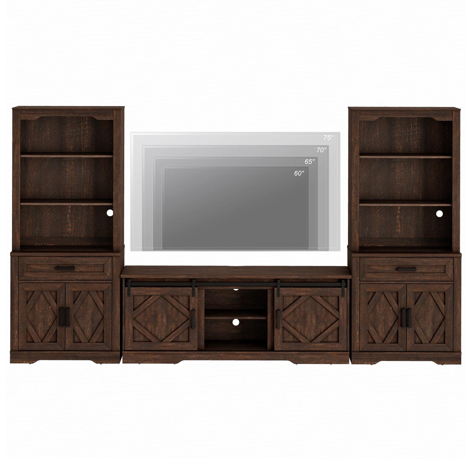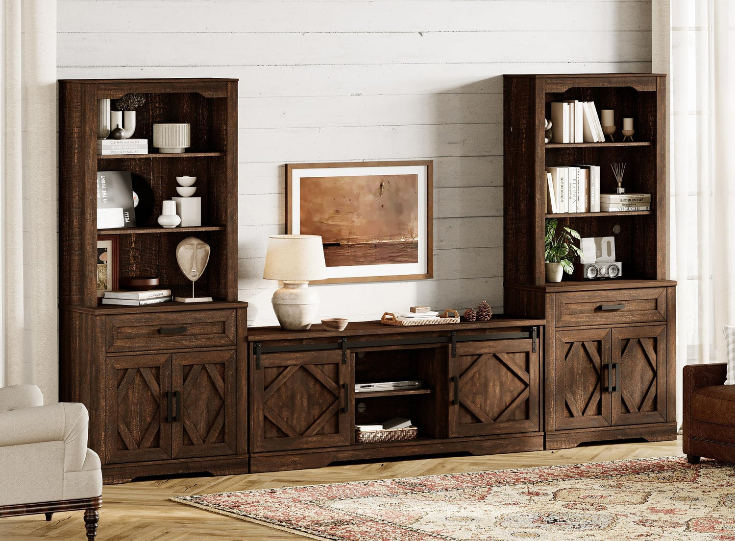 WAMPAT Farmhouse Entertainment Center with Bookshelf for TVs up to 75",Mid Century Modern TV Stand with 73"H Tall 5-Tier Bookcase with Open Storage and Barn Doors for Living Room,Bedroom,Rustic Brown