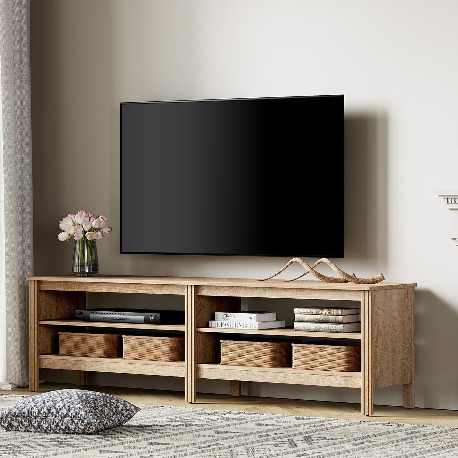 - 【Humanized Detail Design】The oak finishes give this 70 inch entertainment center a look of real wood.Without the limitation of the back board allows the disorganized wires to be placed in order. The distance under the media cabinet is large enough for robot vacuum cleaner pass freely.