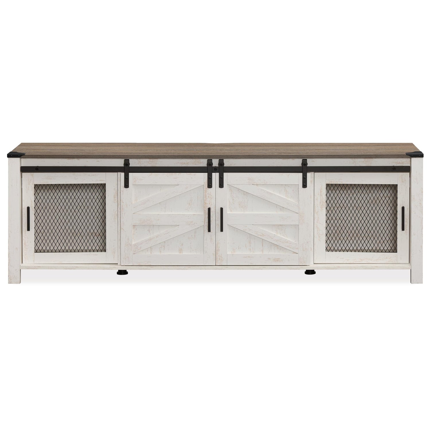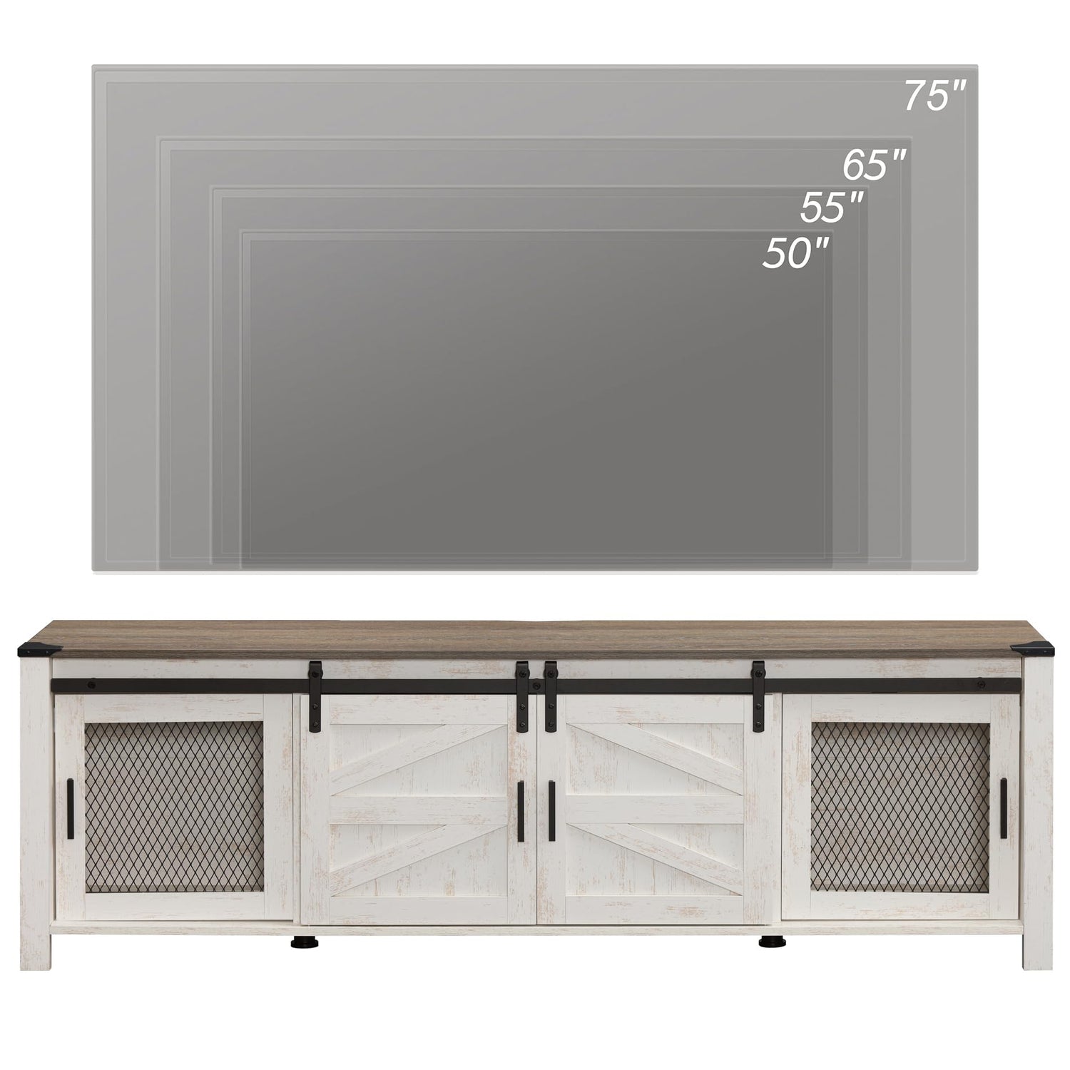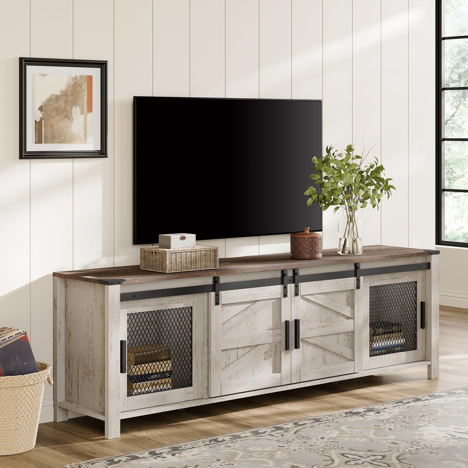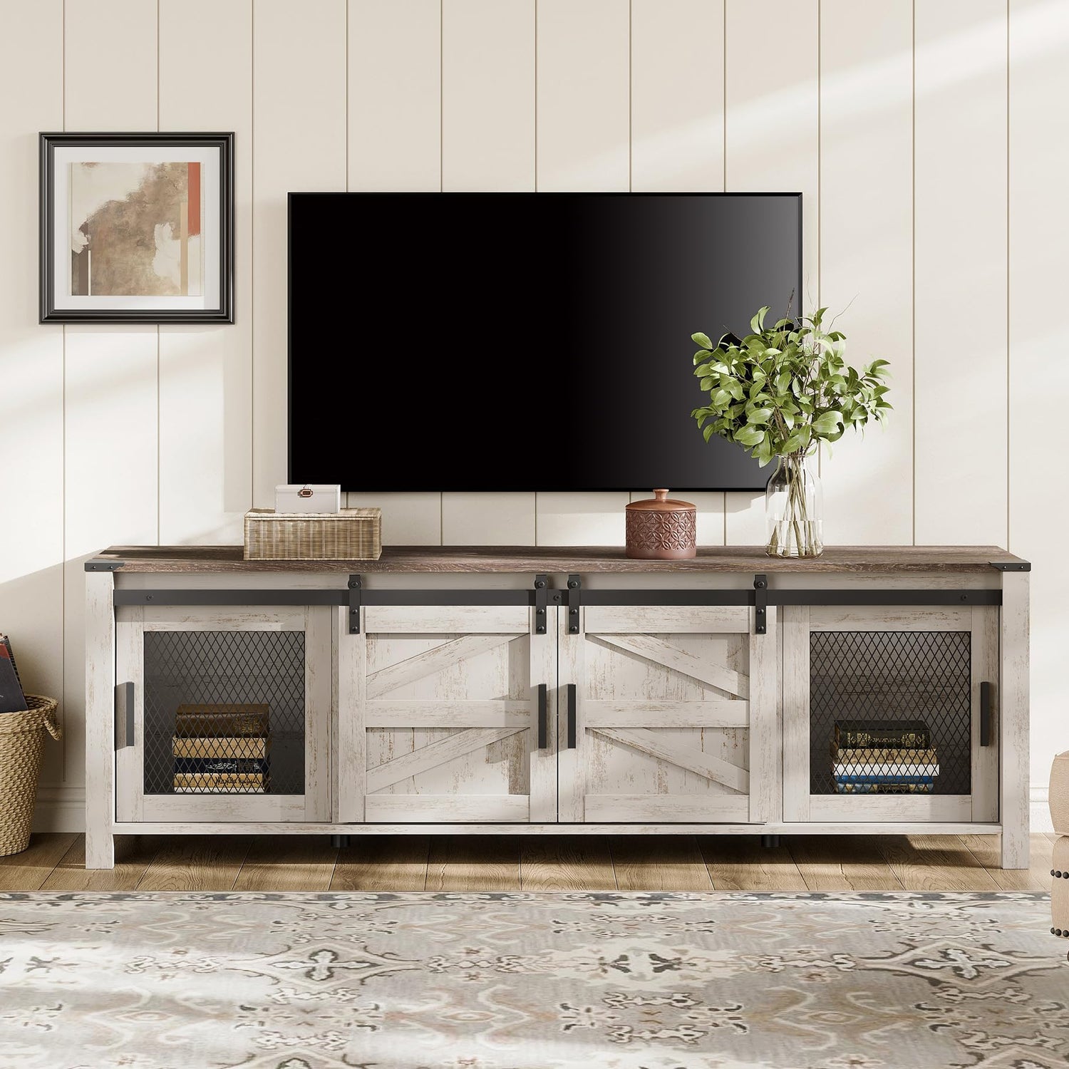 WAMPAT Farmhouse TV Stand for ups to 75 inch TV, Wooden Entertainment Center with Mesh Barn Doors, Media Console with Storage Shelf for Living Room Bedroom, Rustic Oak and White