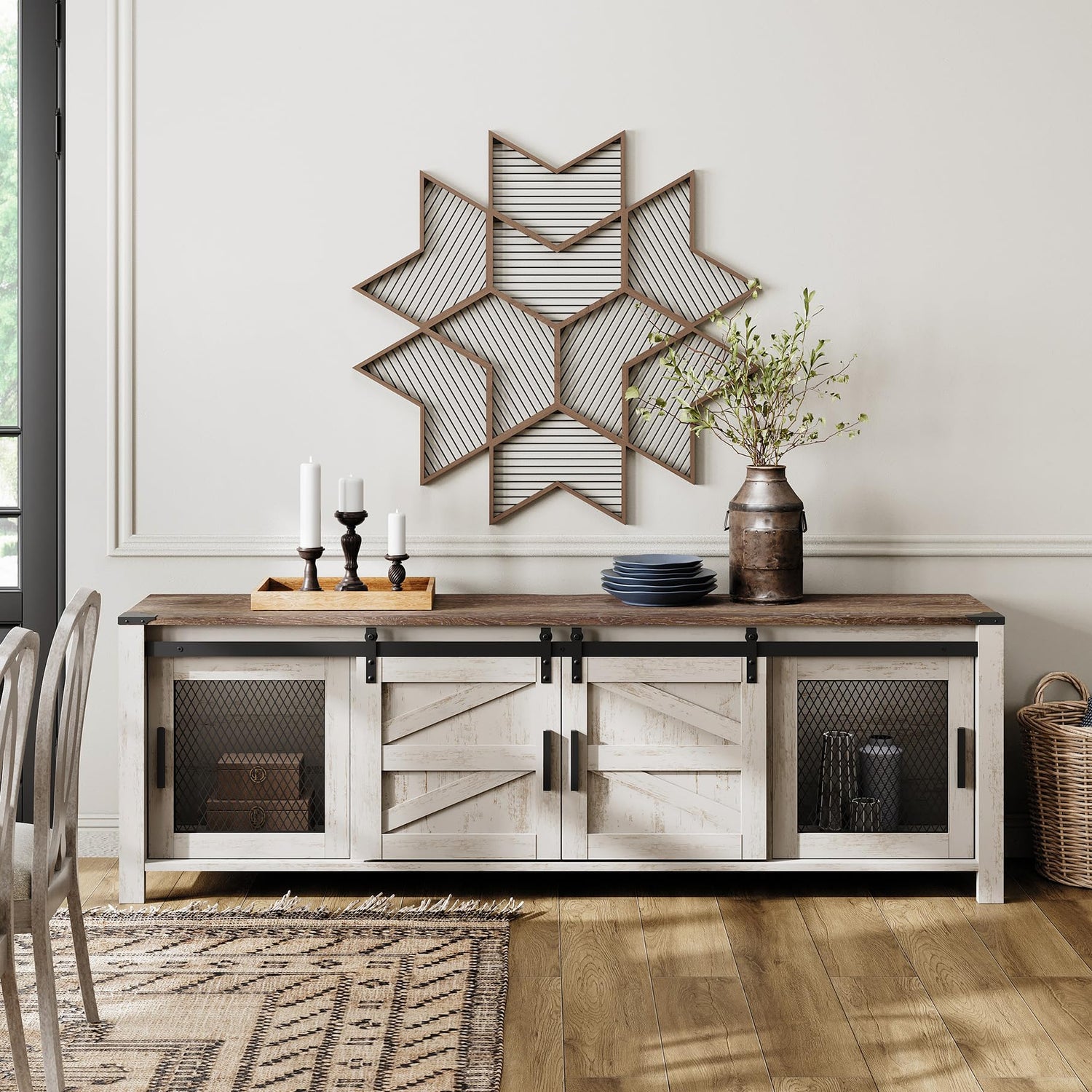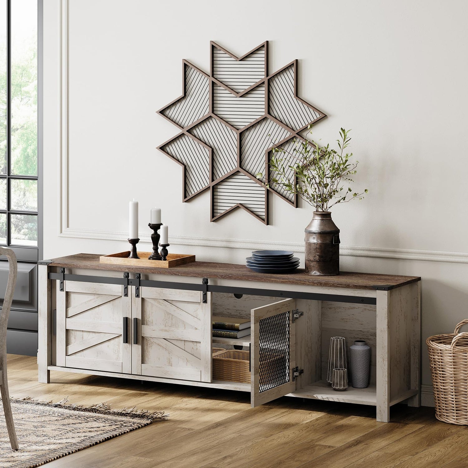 - Simple & Exquisite Design:The TV stand is made of unique spliced wood and fixed with metal bars and rivets. The simple frame and characteristic barn door design elements are very suitable for your rustic, industrial, or retro-style home decoration
