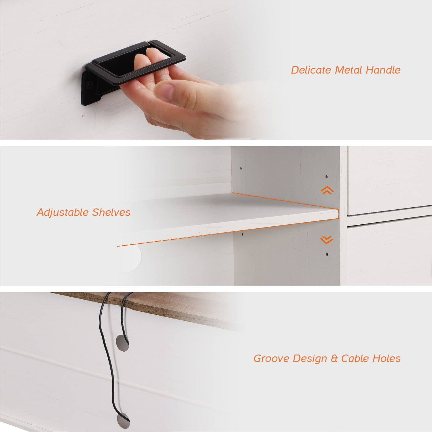 - 【Cable Management】Multiple cable management round cutouts on the back panel and a notch design on the tabletop make it easy to organize audio receivers and DVD players and easily hide all cords, contributing to the neat appearance of the TV cabinet.
