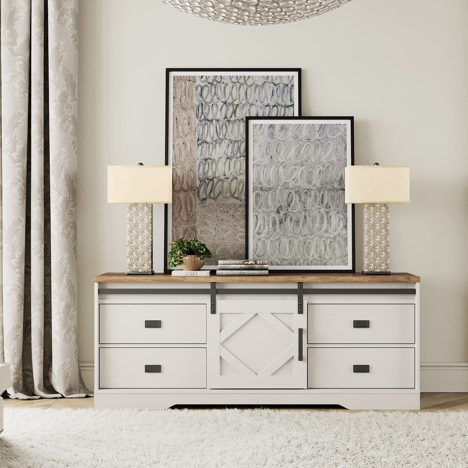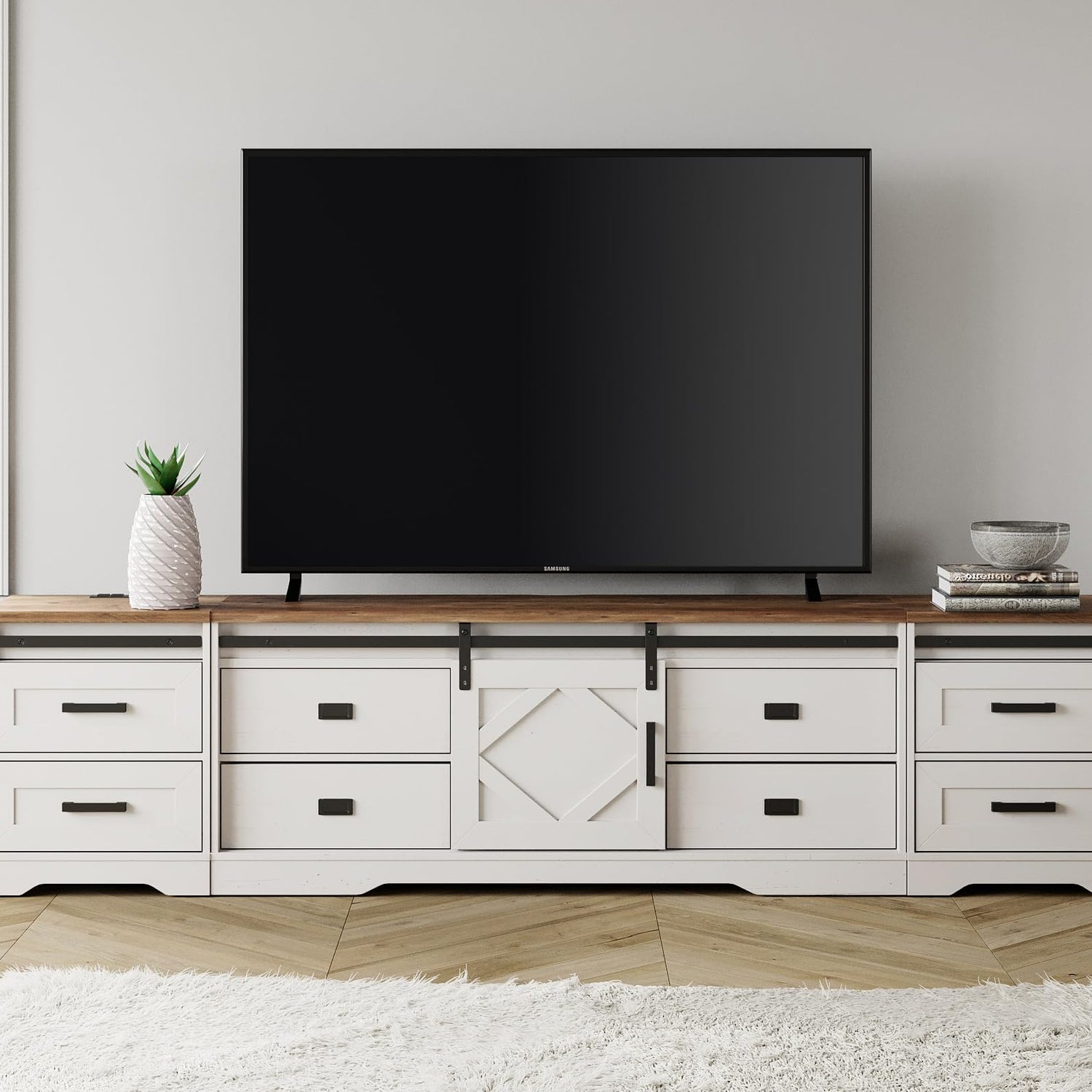 - 【Farmhouse Style】Product Measured: 98.4" W × 15.4" D × 24.3"H, Fits for flat curved screen TVs up to 110''. It features a perfect blend of modern farmhouses. The finish that resembles the surface grain of tree bark delivers a naturally aged feel and creates a cozy and retro vibe. Suitable for all decor style and increase aesthetic for your living room.