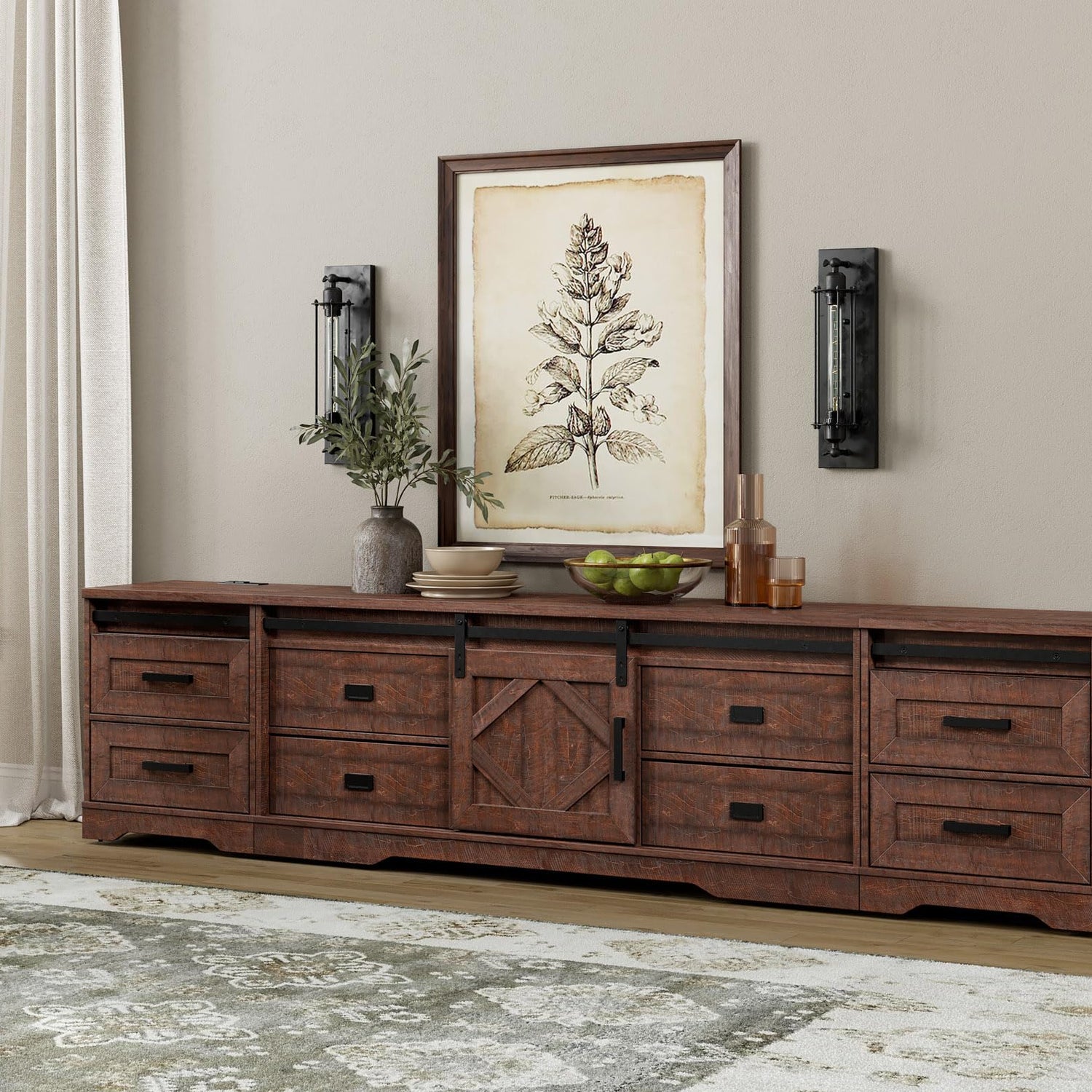 - 【Farmhouse Style】Product Measured: 98.4" W × 15.4" D × 24.3"H, Fits for flat curved screen TVs up to 110''. It features a perfect blend of modern farmhouses. The finish that resembles the surface grain of tree bark delivers a naturally aged feel and creates a cozy and retro vibe. Suitable for all decor style and increase aesthetic for your living room.