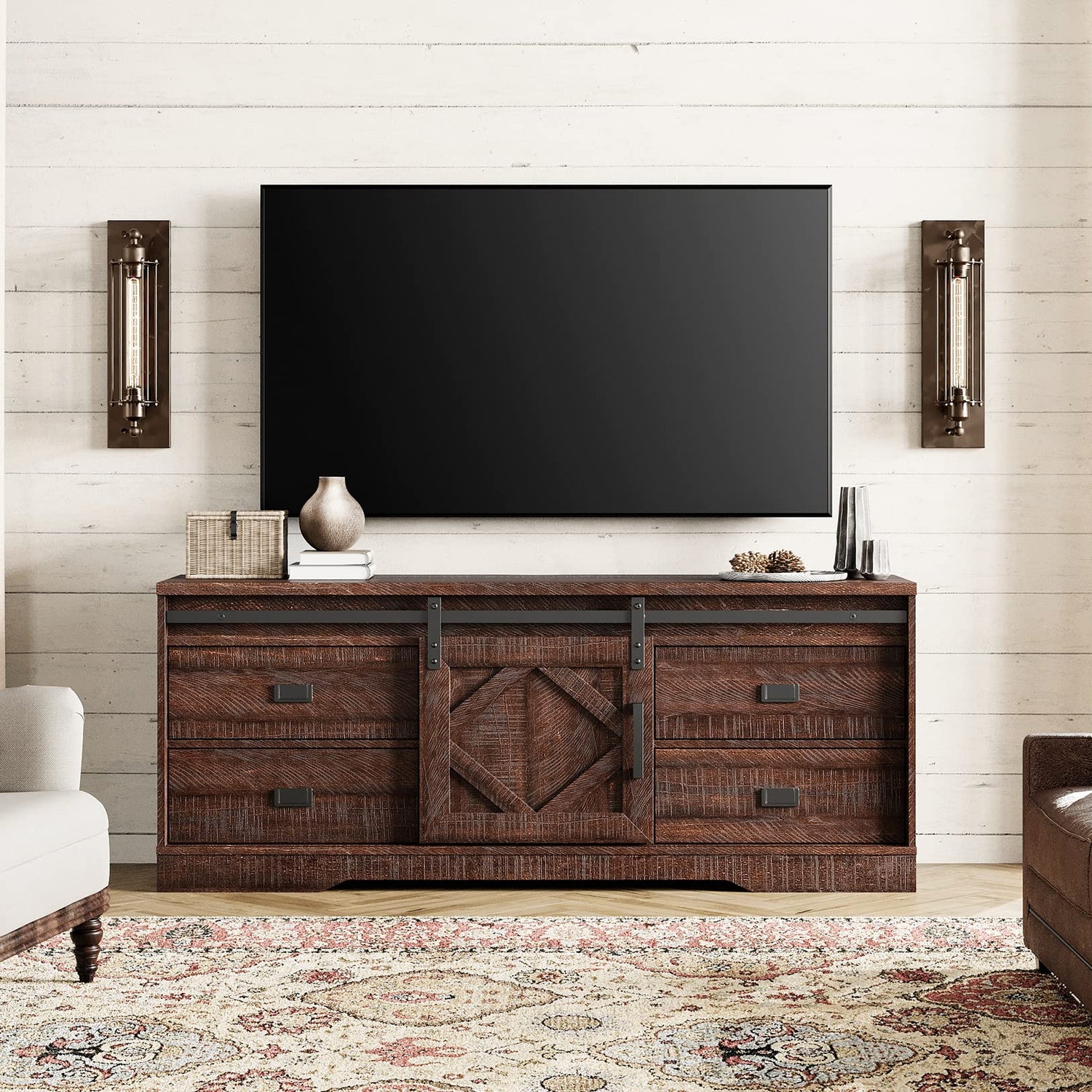 WAMPAT Farmhouse TV Stand with Charging Station and USB Ports for TVs up to 110" TVs,3 in 1 Wood Entertainment Center with 10 Drawers and Adjustable Shelves for Living Room, Rustic Brown