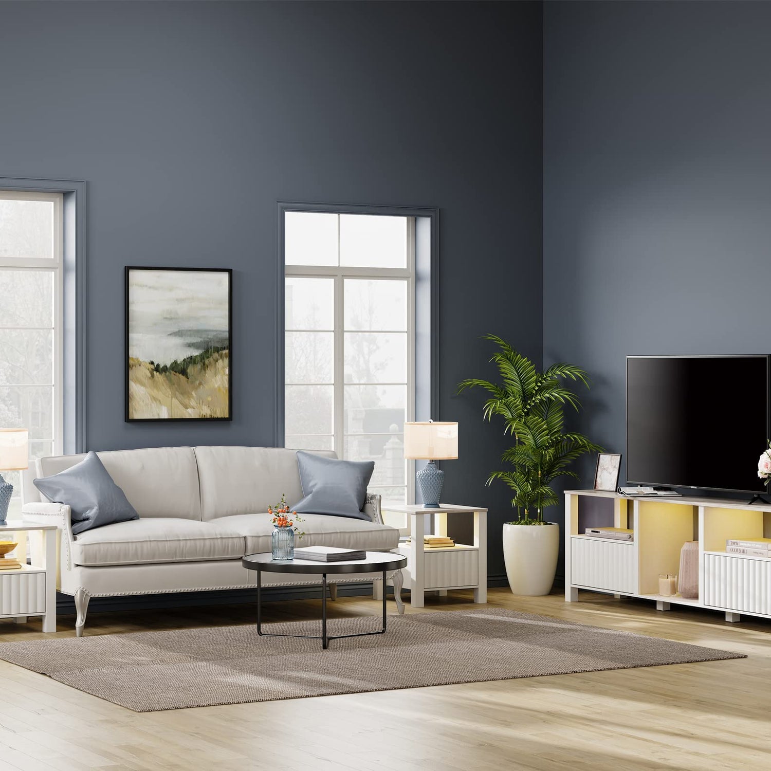 - 【3-in-1 Extra Large TV Stand】The tv table can accommodate TVs up to 100", of course, it is also suitable for 65", 70", 75", 80" and 85" flat screen. It must be mentioned that the 3-in-1 large size TV stand is designed for oversized televisions, it also can be used separately as one 70 inch TV stand for 75" TV and two small end tables. Overall dimension: 105.2"×18.1"×23.2"(L×W×H).