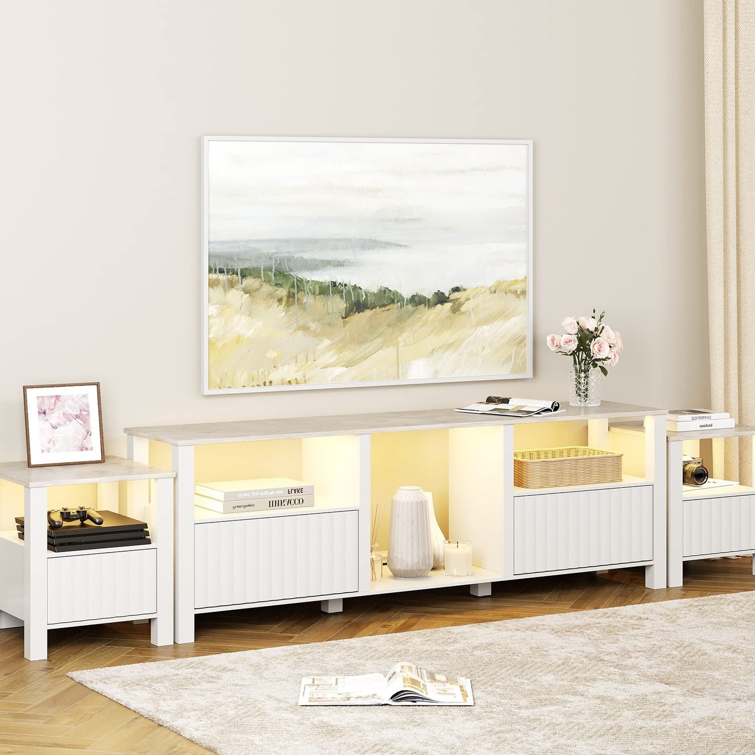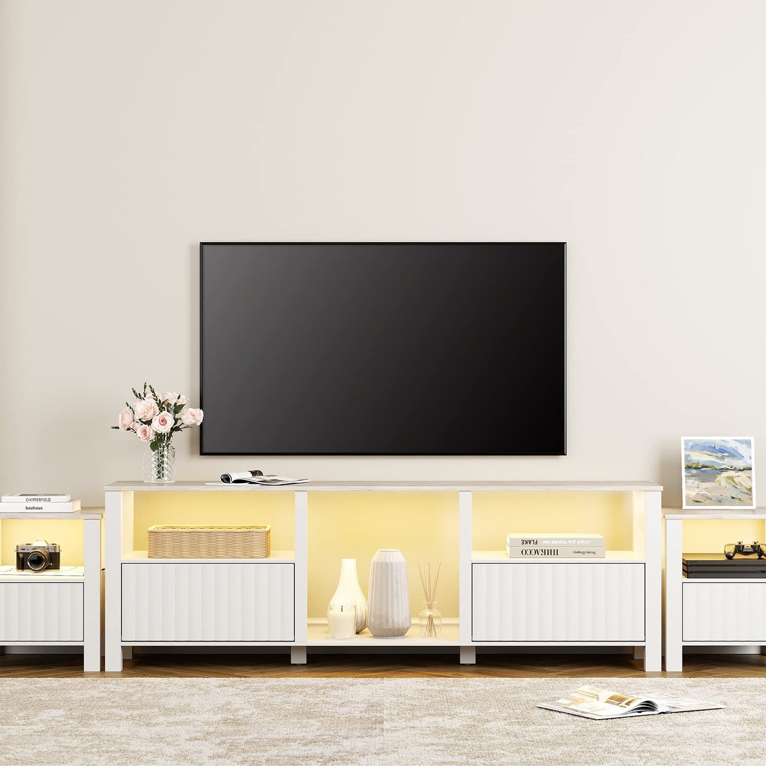 - 【With Yellow LED Light】The tv console table comes with warm white LED light strips, creating amazing lighting effect and warm atmosphere to your room. Designed with 5 open shelves and 4 storage cabinets, the entertainment center offer ample storage space to you. And the cabinet door is equipped with hydraulic door closer for smoother and quieter user experience.
