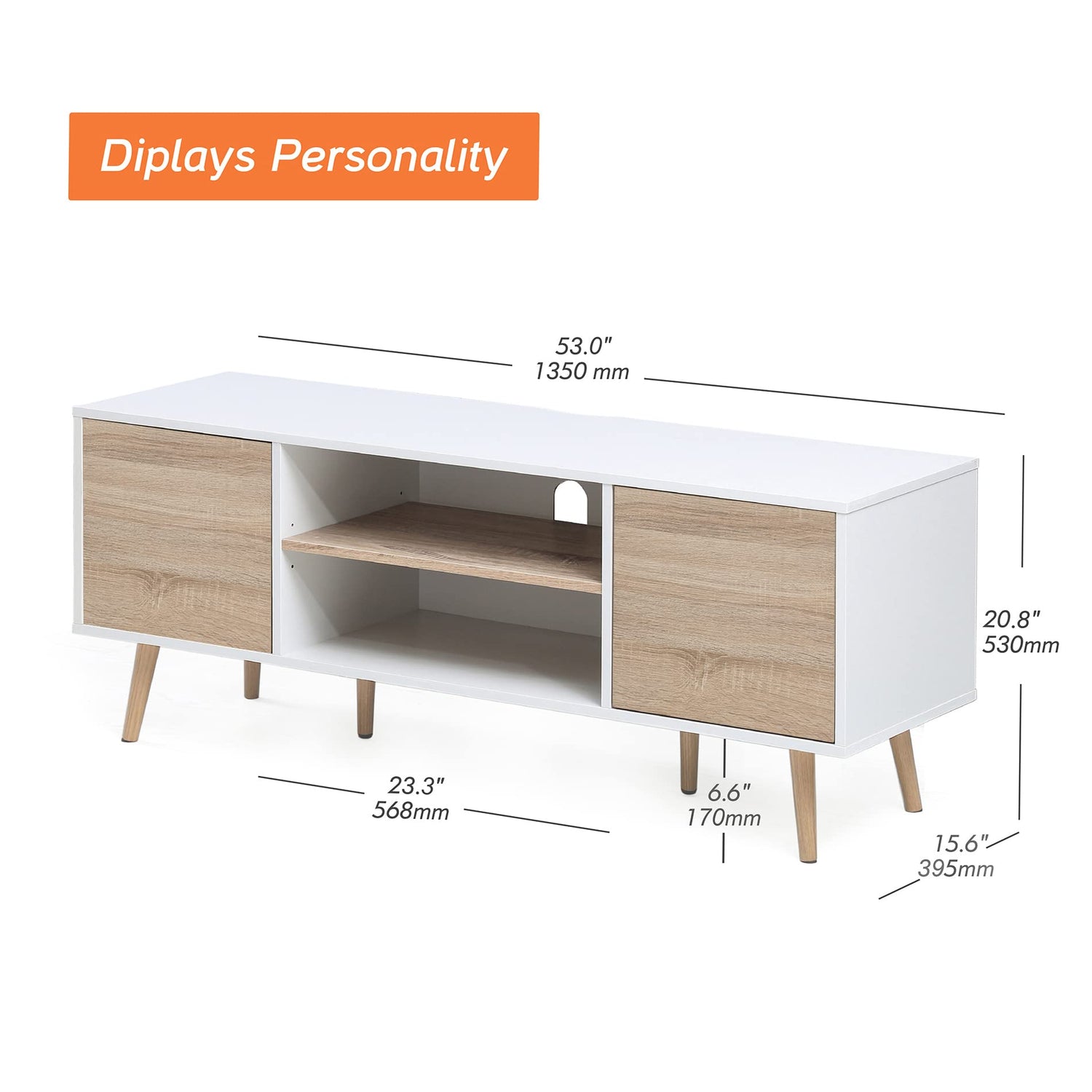 - 【Selected Material】The Television Stand is designed with dimensions of 53.1" L x 15.6" W x 20.9" H. Recommended TV's up to 60" TV's. Made from high-grade particle board material that promises a long service life. The overall finish is quite smooth and waterproof without any smell no harm and easier to clean, Weight limit of top board is 175 lbs.