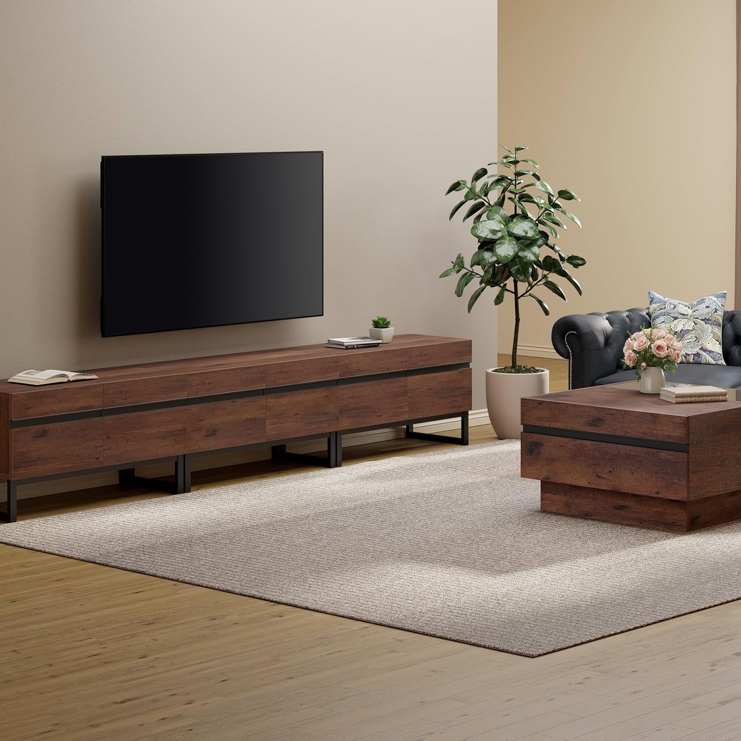 - 【Modern Design】The TV stand and coffee table feature concealed door handles for a neater appearance. Adorned with a walnut grain design, it seamlessly complements various decor styles, from modern simplicity to American country and tranquil pastoral themes. It's an excellent addition to elevate your home's aesthetic.