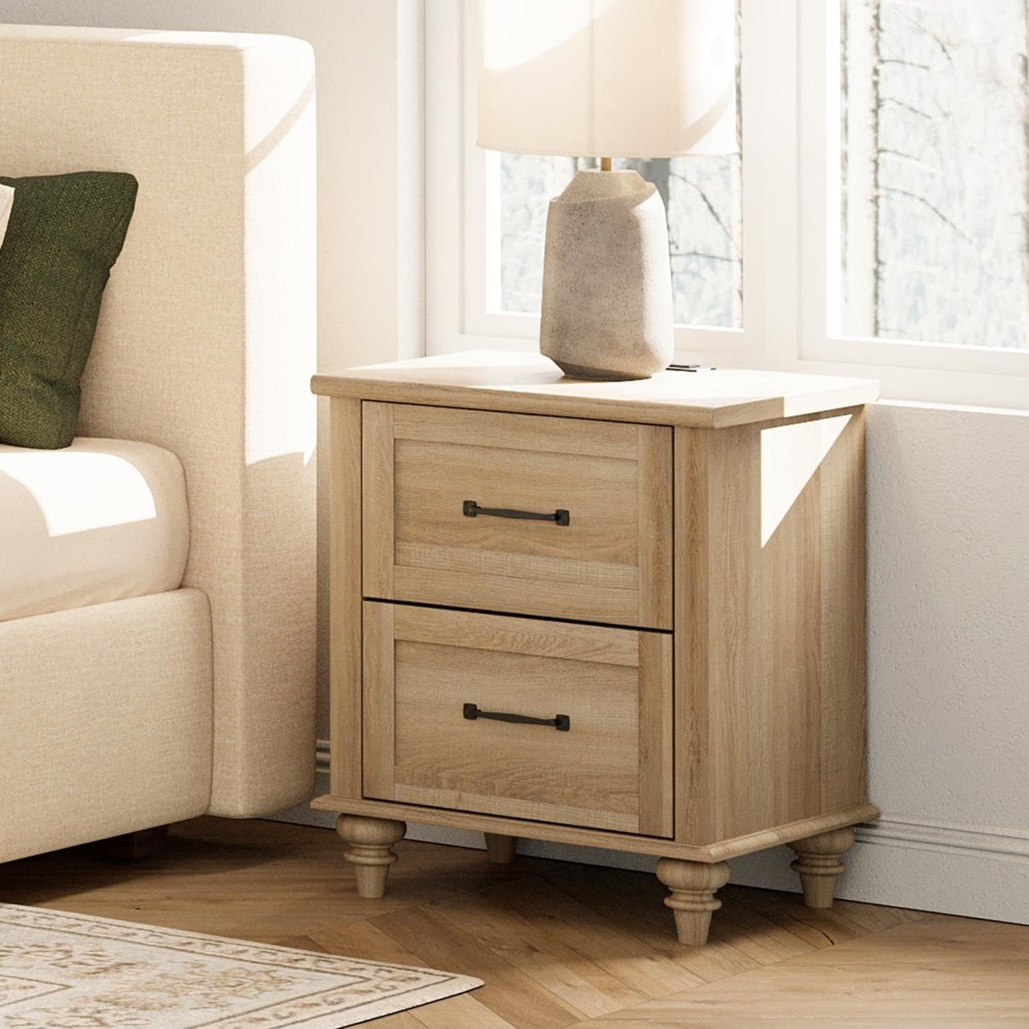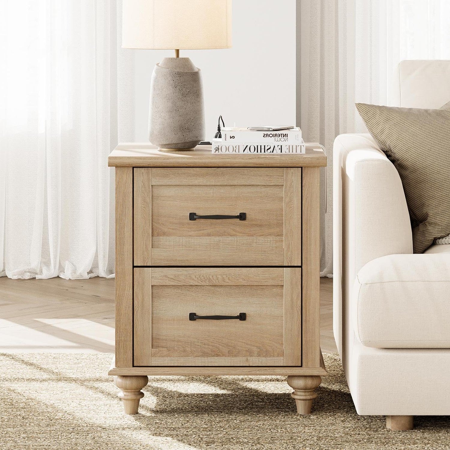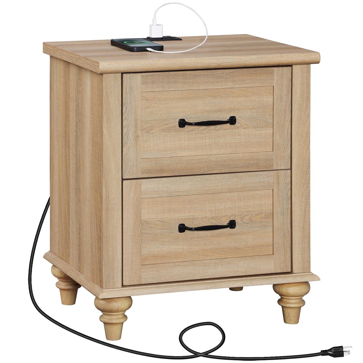 WAMPAT Nightstand with Charging Station, 20 Inch Night Stand with 2 Drawers, Wooden Rustic Bedside Table End Tables with Solid Wood Legs for Bedroom, Natural Oak