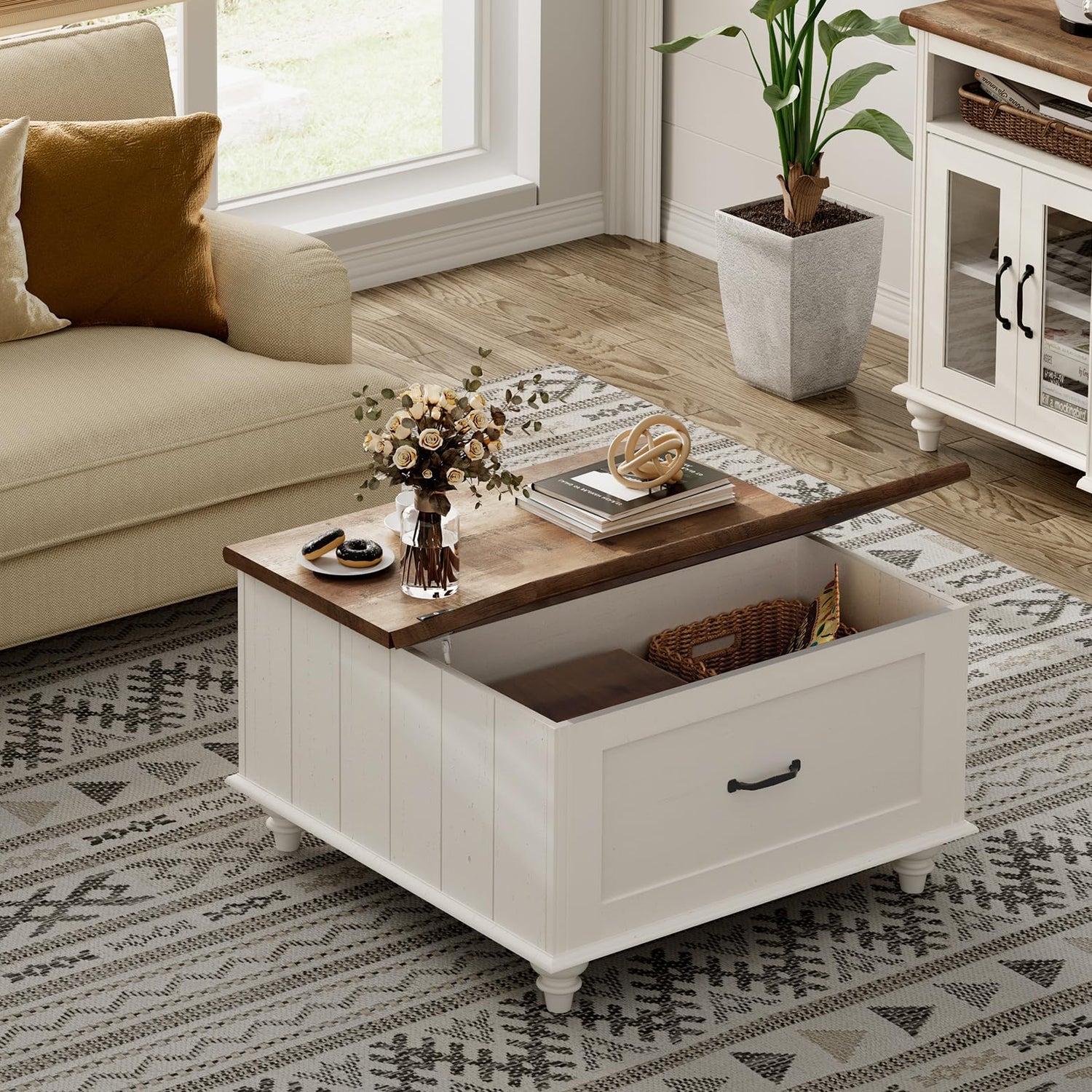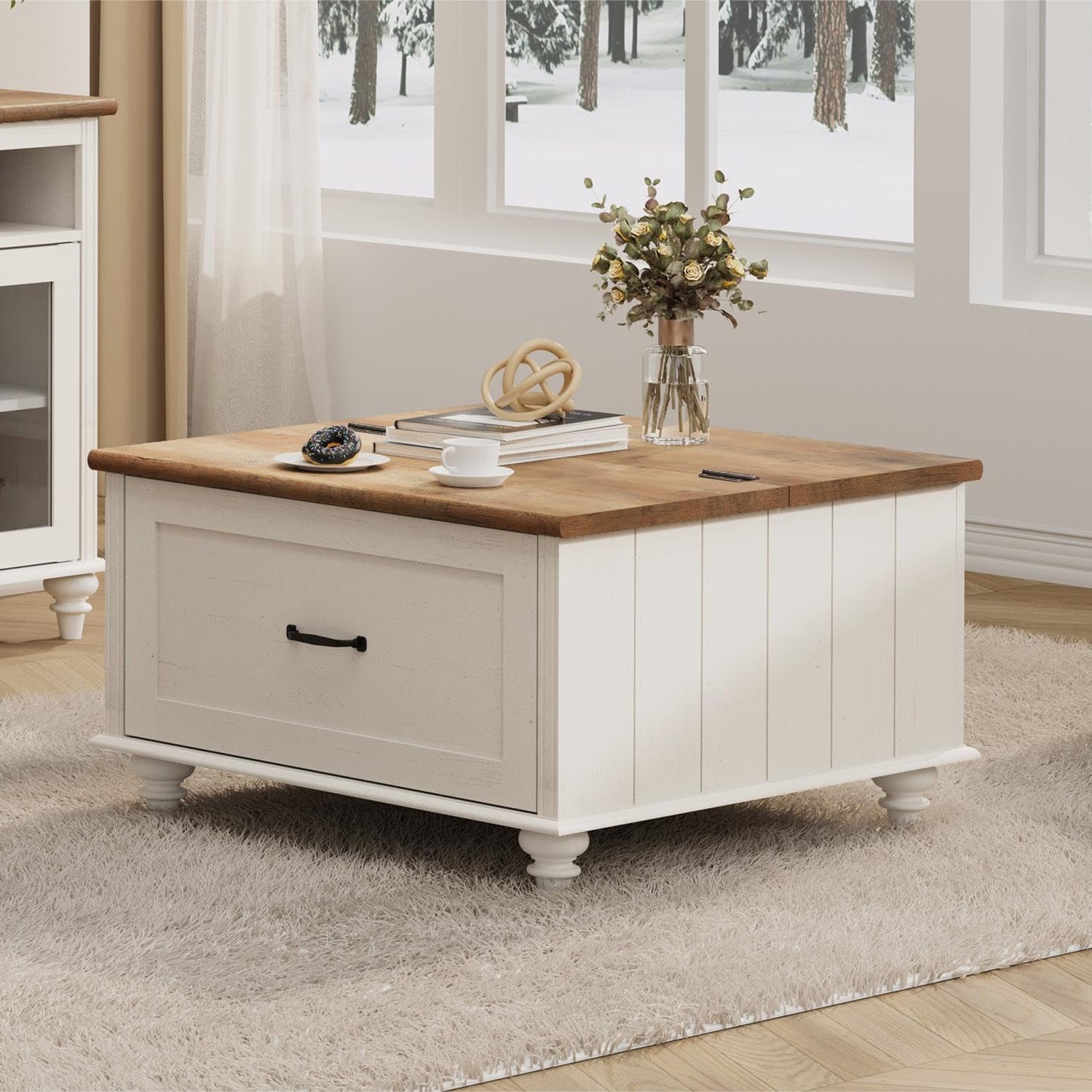 WAMPAT White Coffee Table with Lift Top & Drawer, Square Wood Center Table with Hidden Storage Compartment, Farmhouse Coffee Table for Living Room, 30 Inch