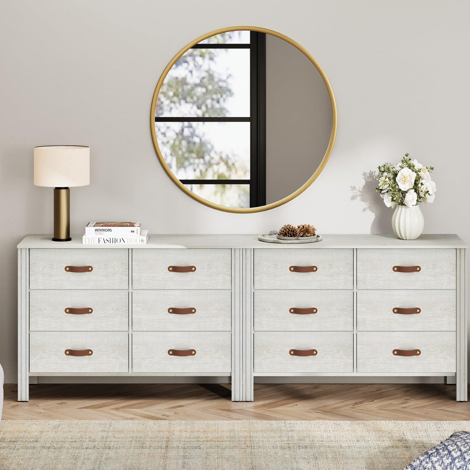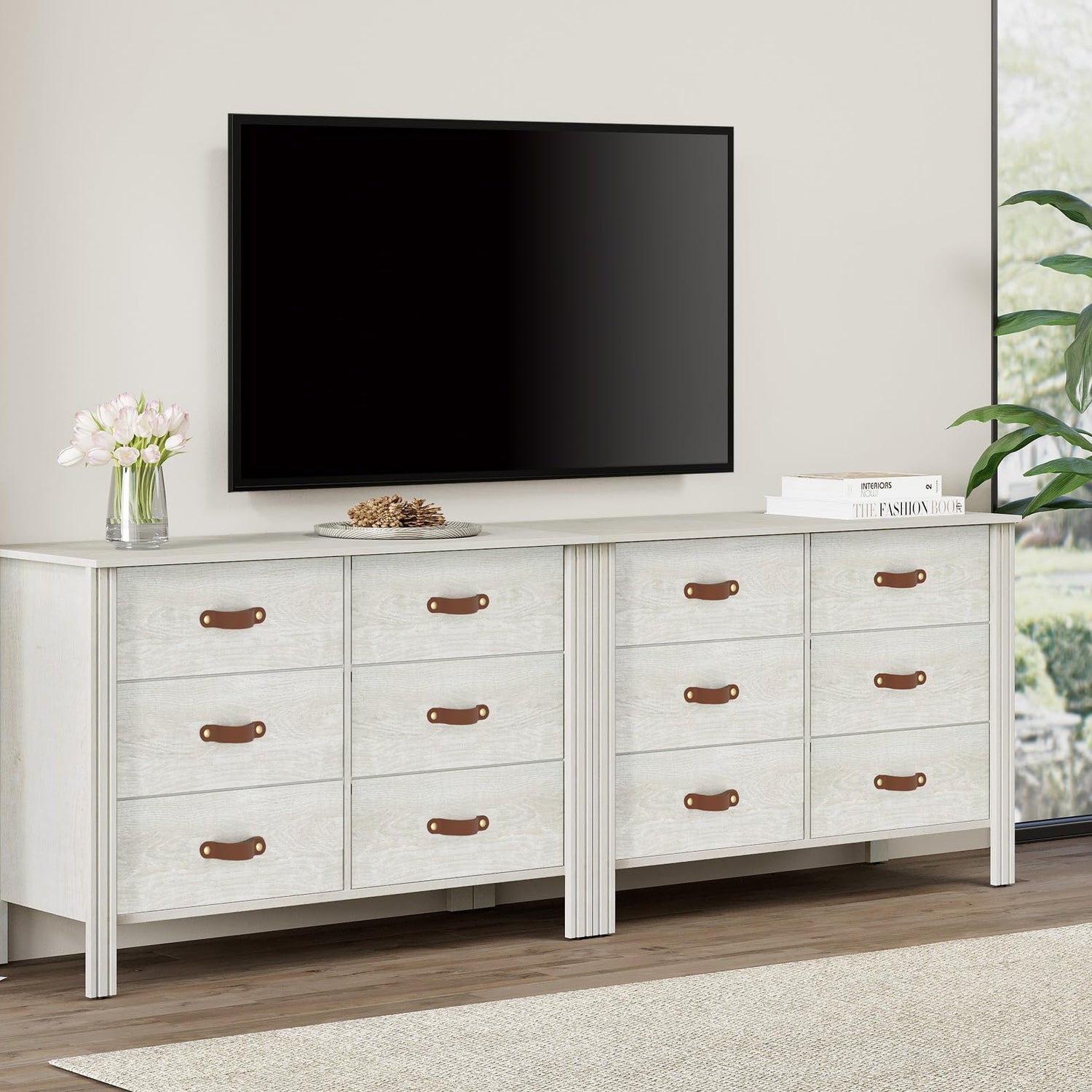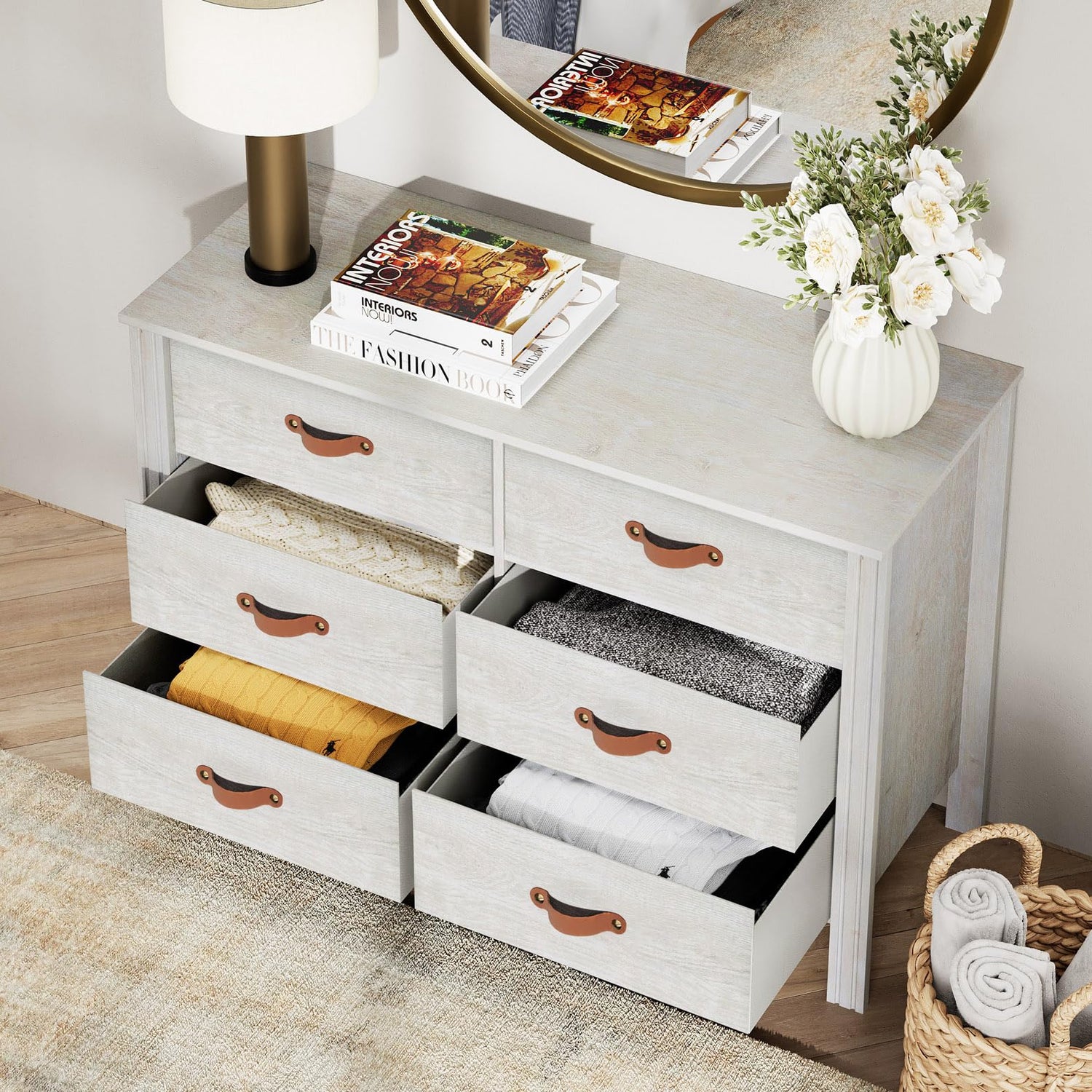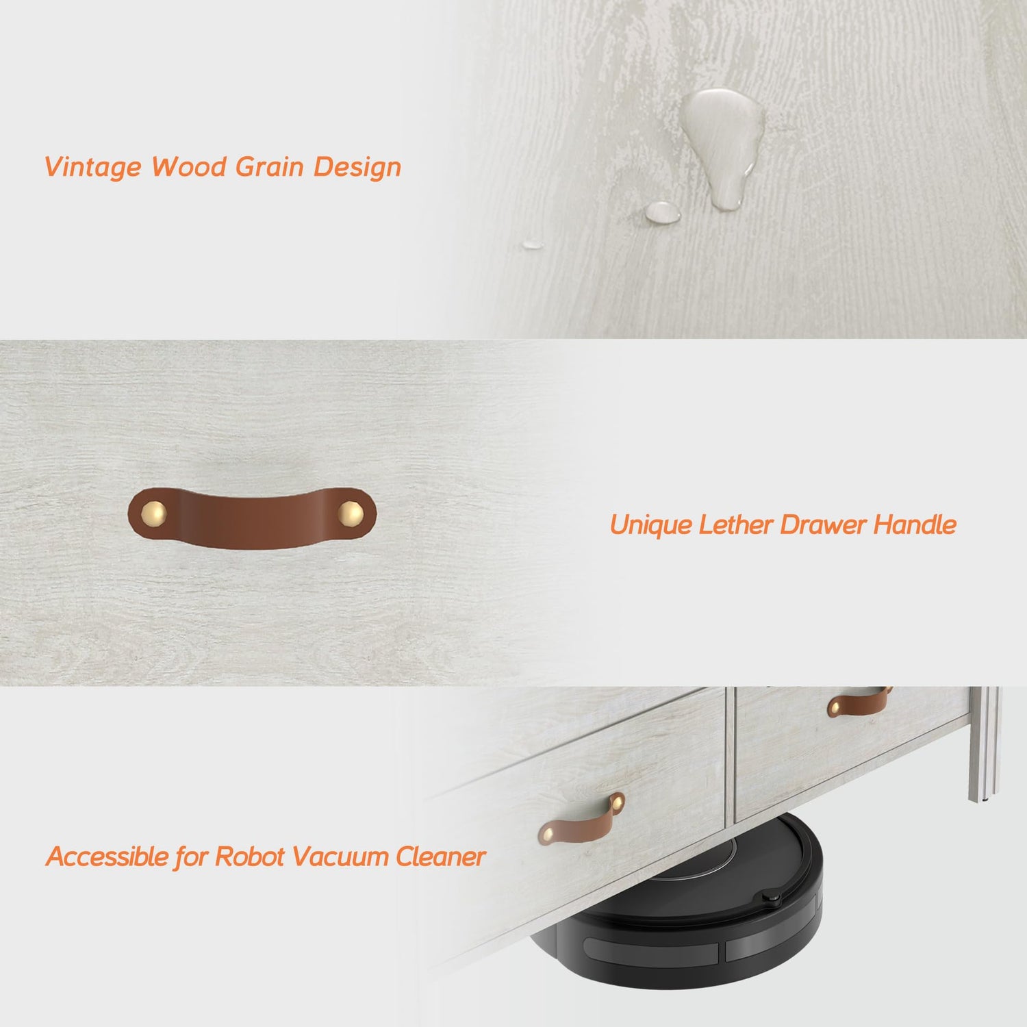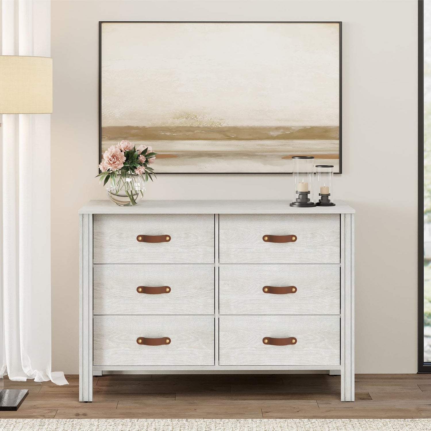 - 【Classic & Exquisite Design】Featuring natural wood grain surface, the white dresser will add gorgeous attraction to your room. Additionally, the unique leather drawer handles offer more elegance. With compact and practical design, the wide dresser occupies smaller room as well as providing more storage space.