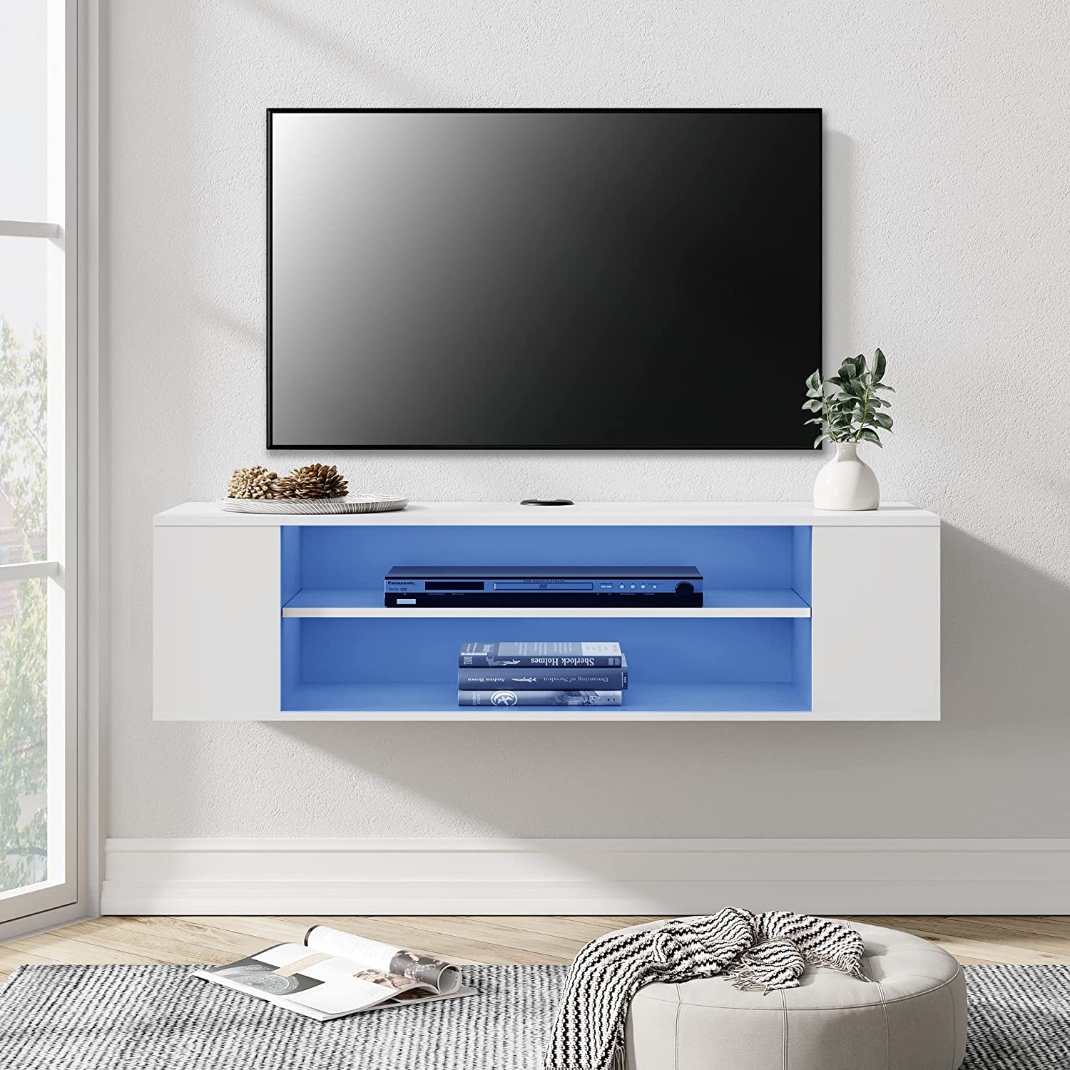 WAMPAT White Floating TV Stand with Blue LED Lights, Floating Entertainment Center Wall Mounted, Floating TV Media Console with Storage Under TV for Living Room,White,39 Inch