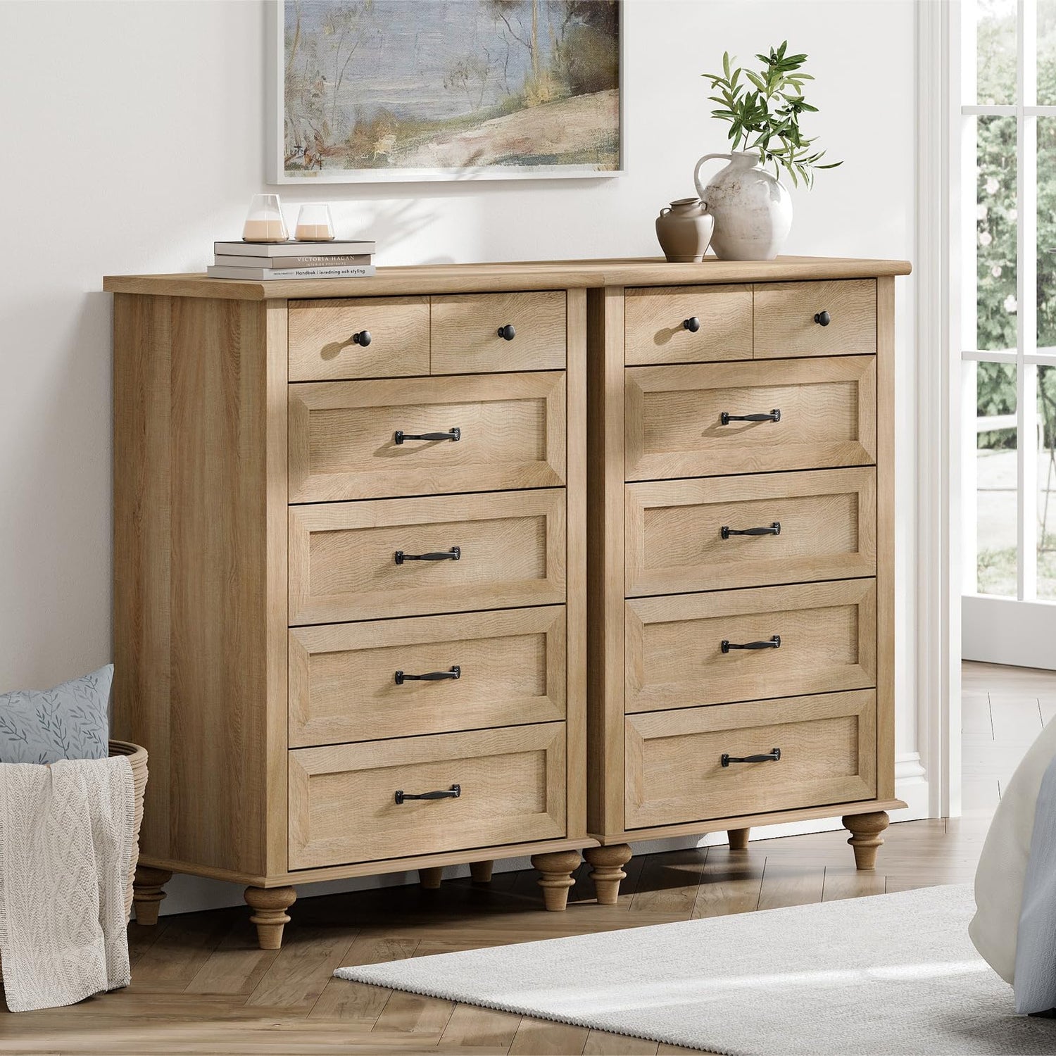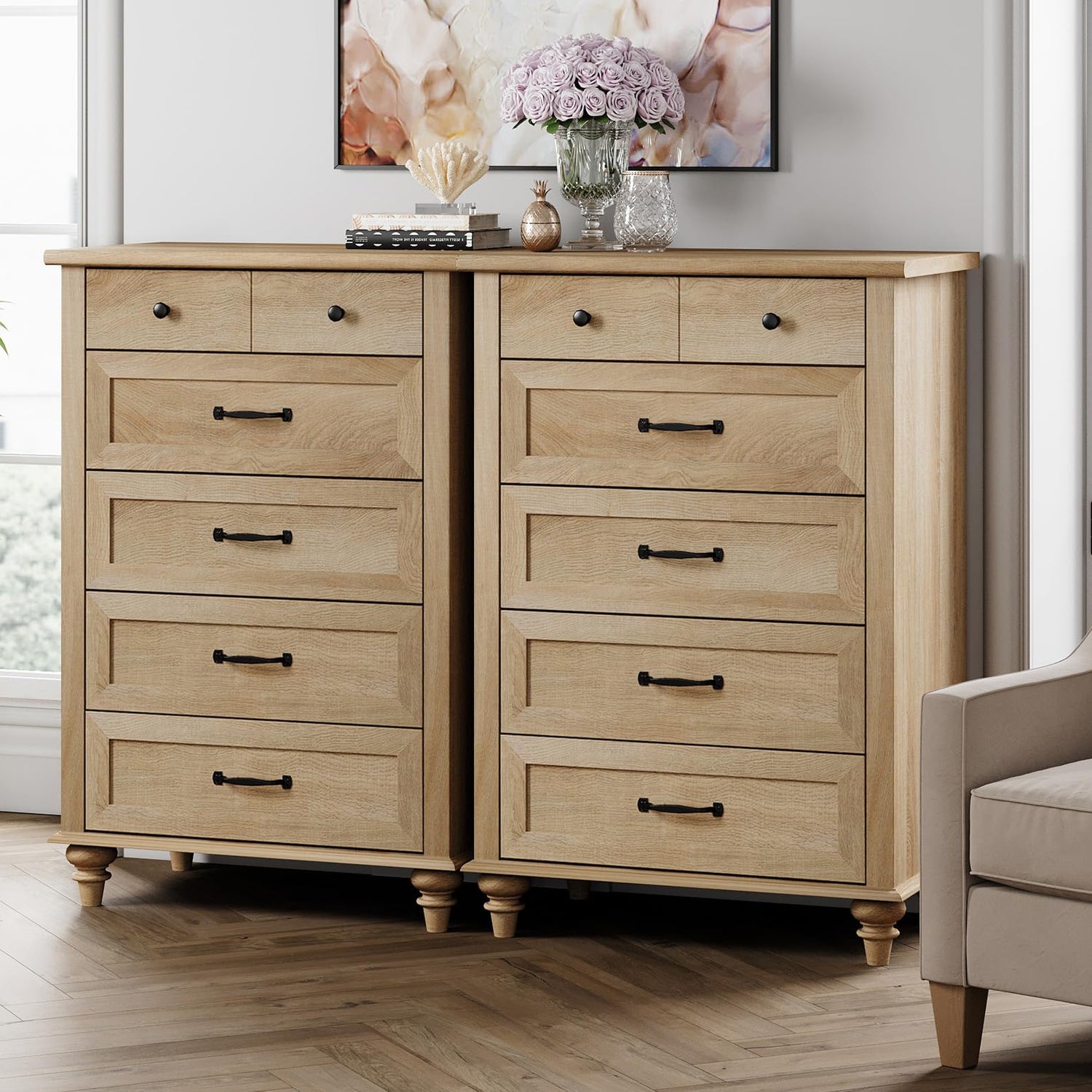 - 【Premium Material & Durable Struction】Combined with high quality P2 MDF material and exquisite craftsmanship, the wood dresser will provide you with sturdy construction and long life span. Additionally, four solid wood round gourd furniture legs ensure overall stability and durability. Total weight capacity of each dresser: 88 lbs. Weight capacity of each drawer: 10 lbs.