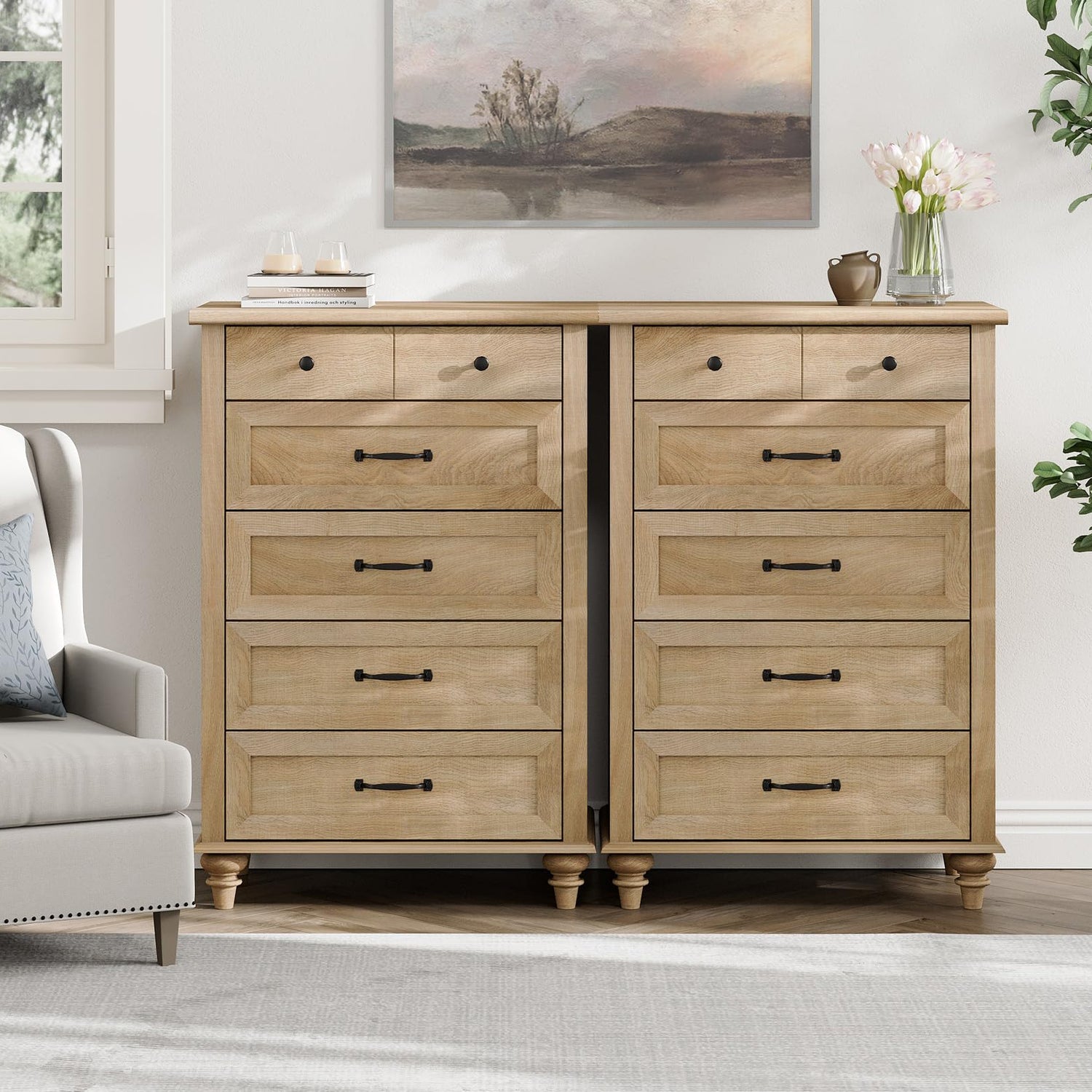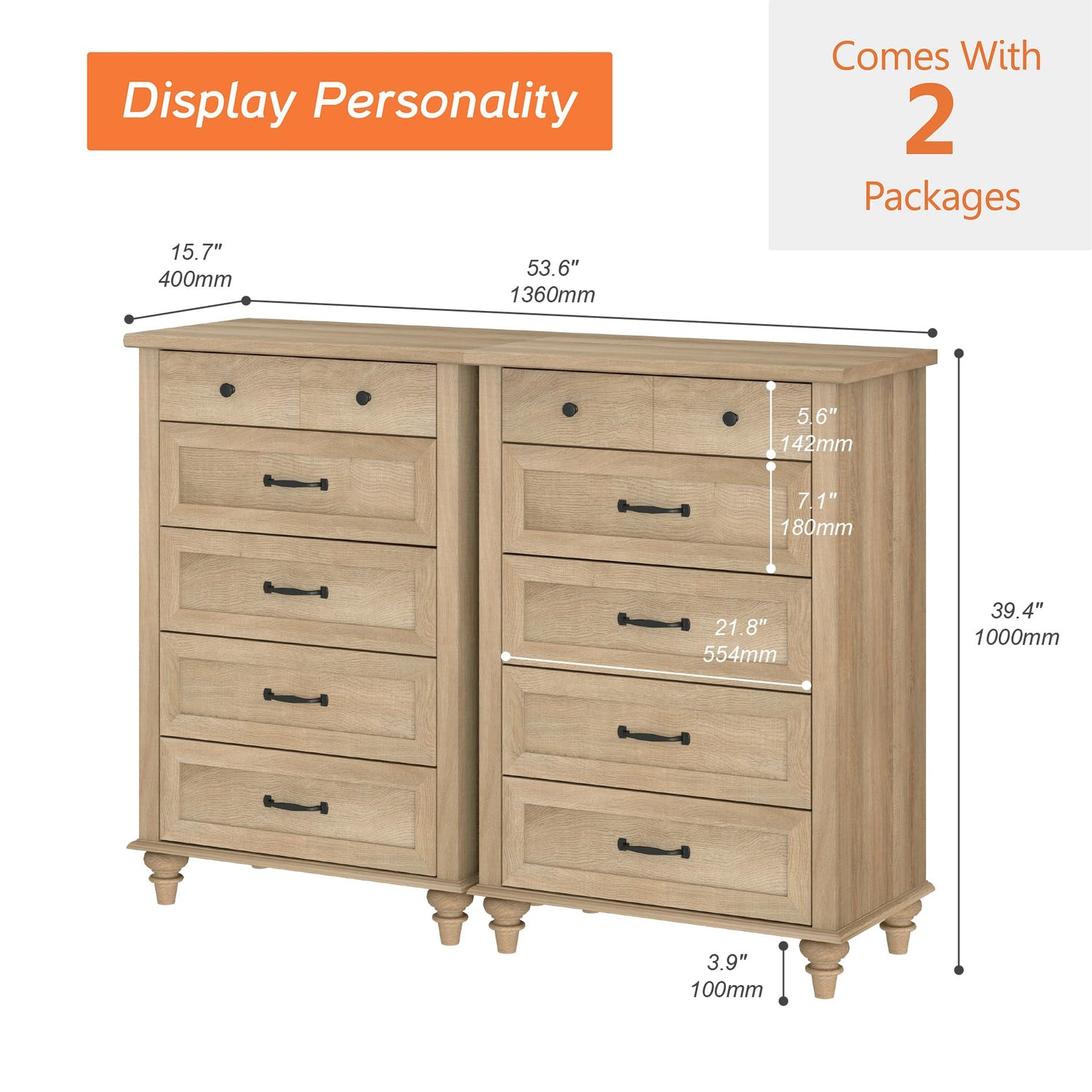 - 【Multipurpose Set of 2 Dressers】The large dresser is consist of two 5 drawer dressers. They can be used together as 10 drawer dresser or tv stand for 60 inch tv. With concise appearance and elegant style, the oak dresser will be harmoniously coordinated with any home style and show your great taste. It is ideal as a baby dresser, kids dresser and console table, etc. Overall dimension: 53.6"×15.7"×39.4"(L×W×H).