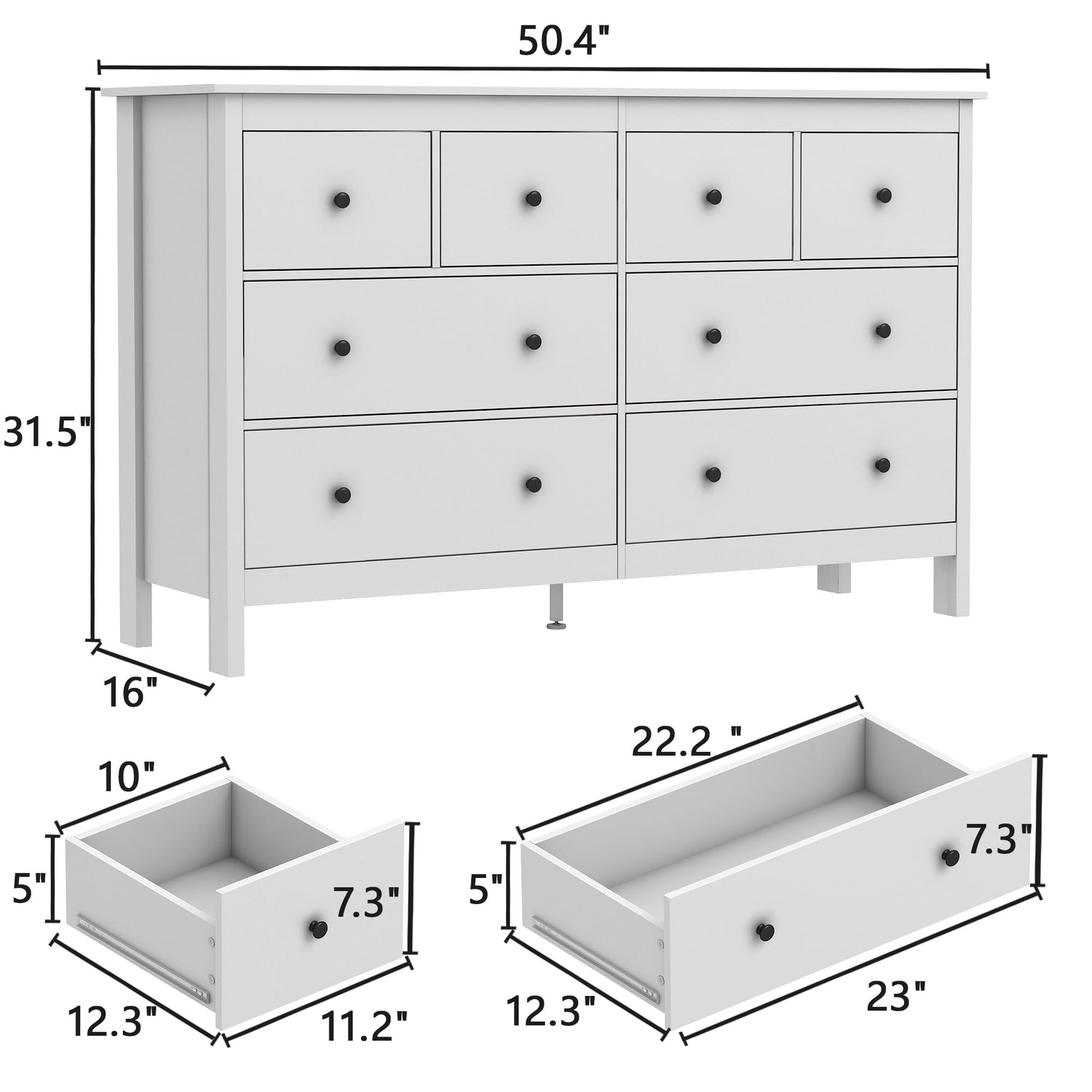 - 8 Drawers Dresser: The bedroom drawers has 8 drawers in two sizes, 4L drawers: 22.2"D x 12.3"W x 5"H; 4S drawers: 10"D x 12.3"W x 5"H. It can provide enough sorting storage space for clothes, pillows, sheets, toys, documents or others in the bedroom or living room