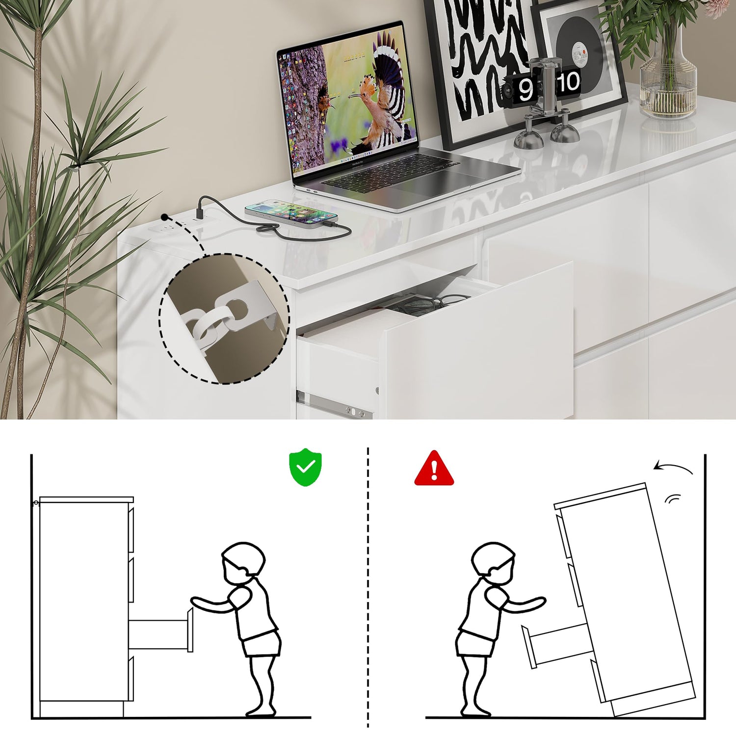 - More Practical Design: The built-in LED lighting beneath the drawer dresser creates a warm ambiance, while the integrated power hub on the desktop offers convenient charging for your devices—all in a sleek, white design that brightens any room