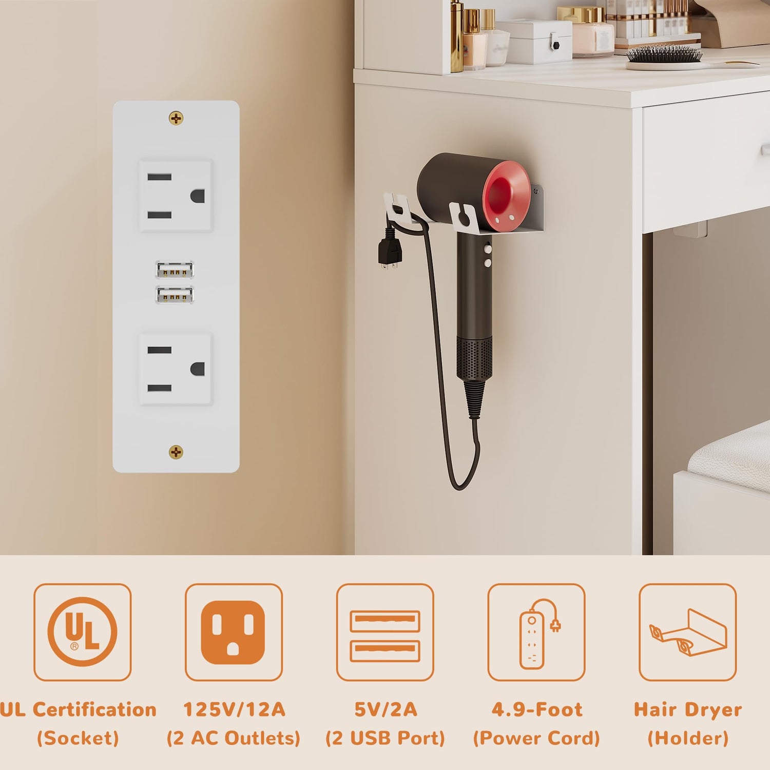 - FULLY CONFIGURED: Small vanity desk comes with a stool, hair dryer holder, and a charging station for easy use of hair dryer and charging of cell phones.