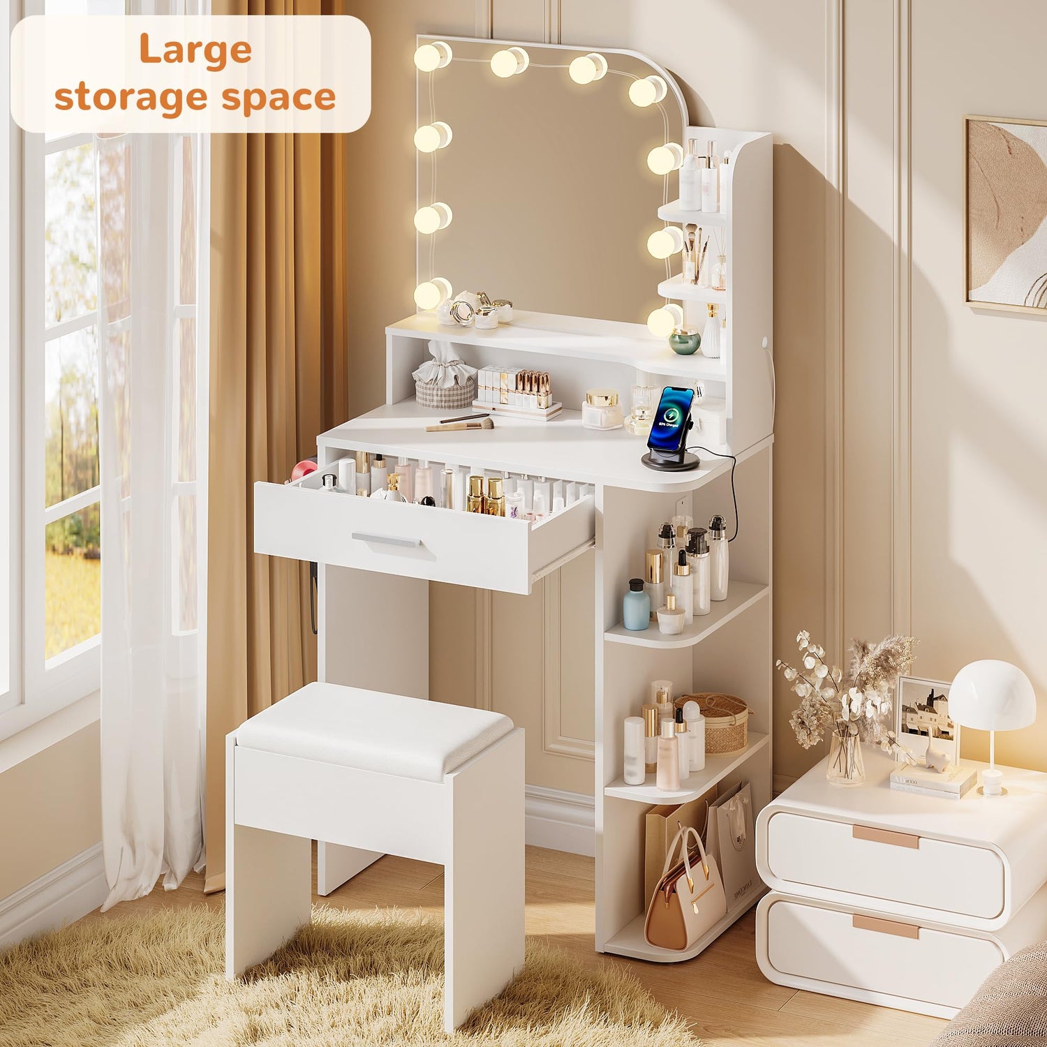 wanan Small Makeup Vanity Desk with Mirror and Lights, Compact Vanity with Chair and Charging Station, 3 Color Lighting Modes for Small Space,White