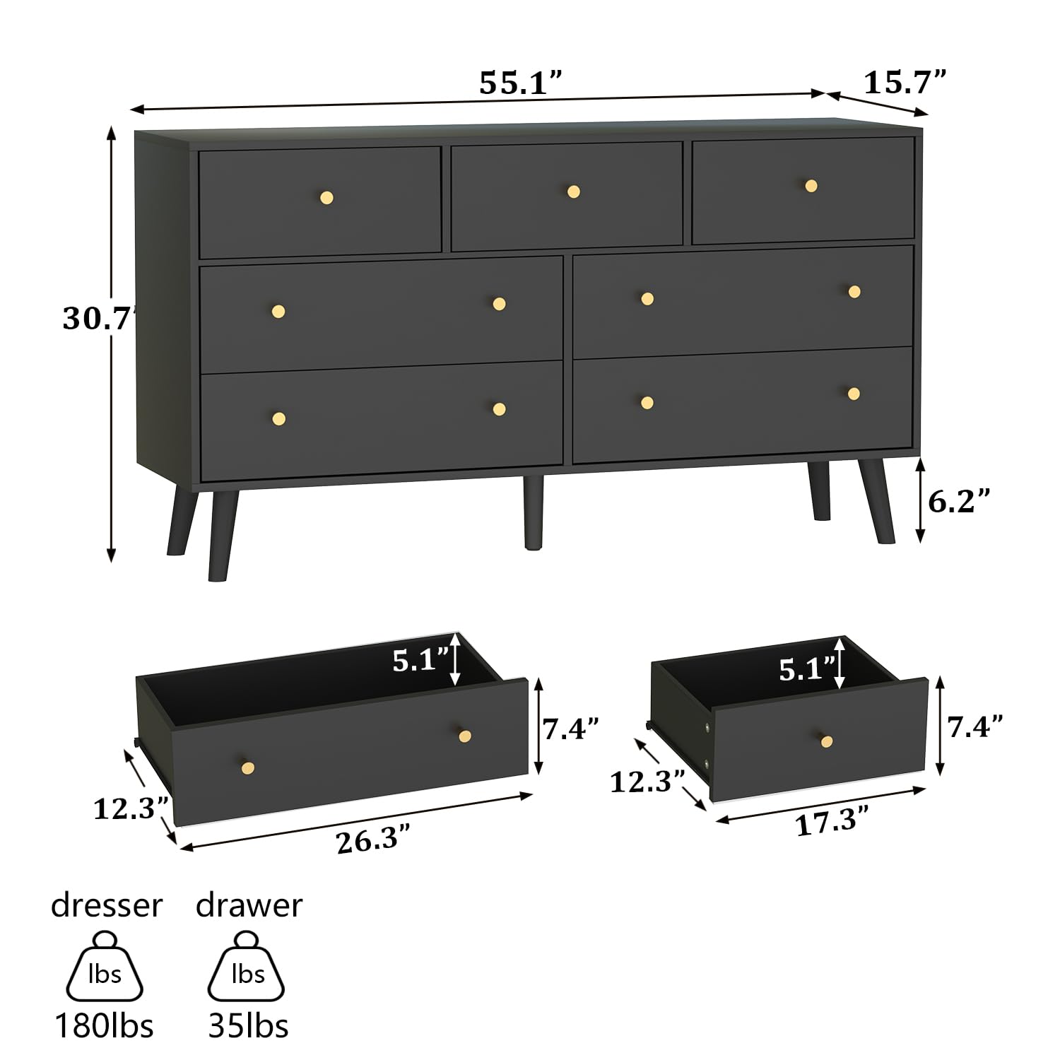Wananlanen 7 Drawers Dresser for Bedroom, 55'' Dressers & Chests of Drawers with Gold Handles and 7 Large Drawer, Modern Double Wooden Storage Organizer Cabinet, Hallway, Black