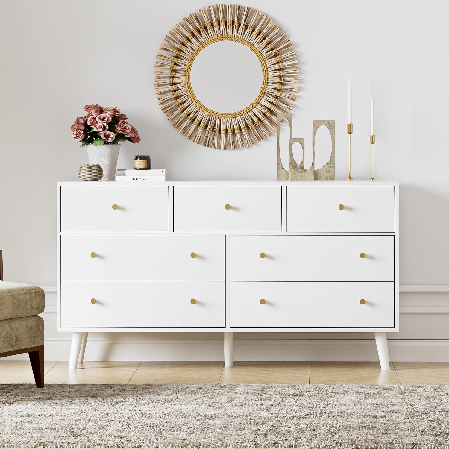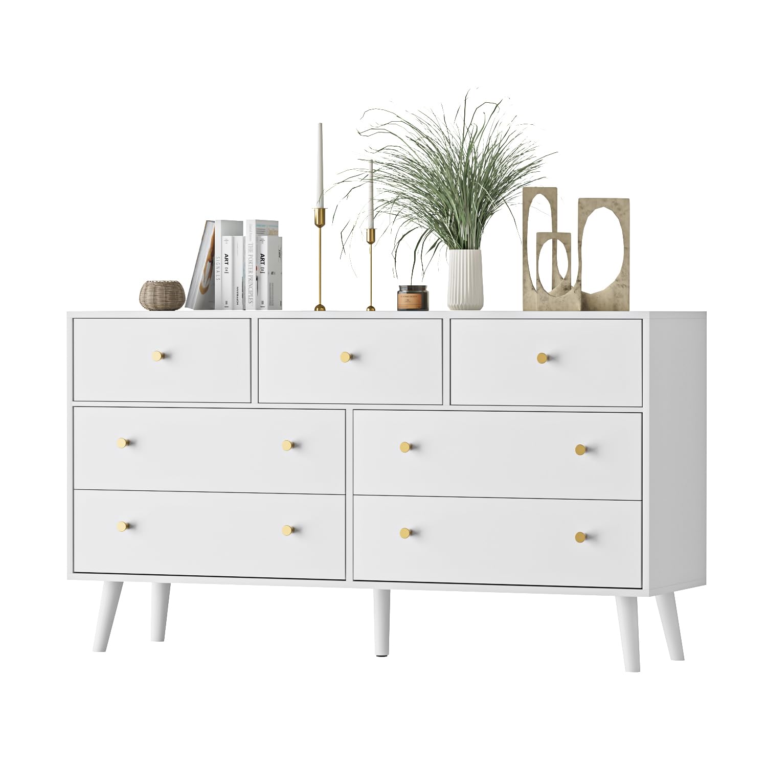 Wananlanen 7 Drawers Dresser for Bedroom, 55'' Dressers & Chests of Drawers with Gold Handles and 7 Large Drawer, Modern Double Wooden Storage Organizer Cabinet, Hallway, White