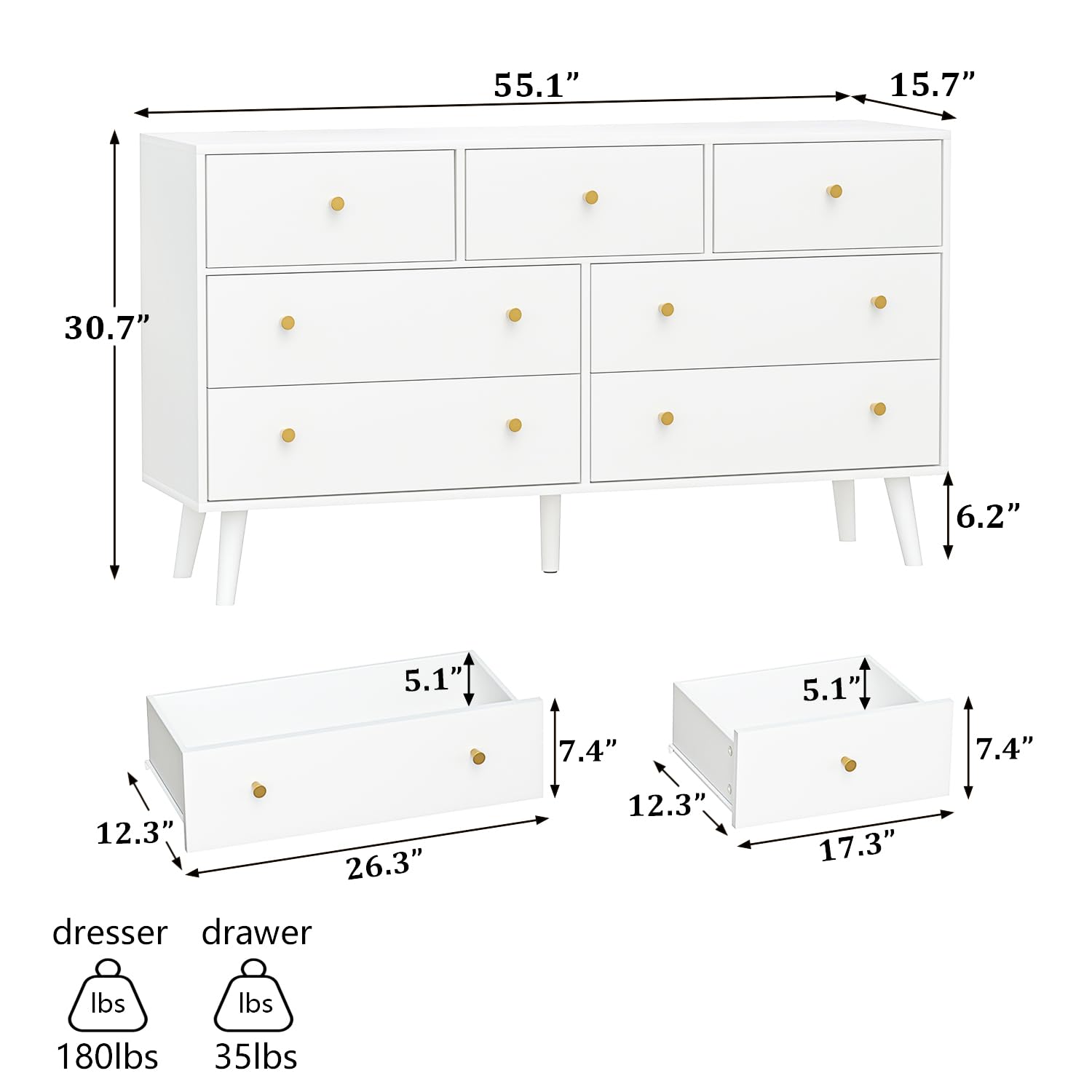 - Charming Modern Design: 15.74"D x 55"W x 30.7"H. The white finish gives a clean and bright look to your room, and the gold metal handles, complement the white wooden frame beautifully, adding a chic and contemporary look. While the modern design suits any style of interior, whether you need a chest of drawers with storage for your bedroom or living room, this 7 drawer dresser is the perfect choice