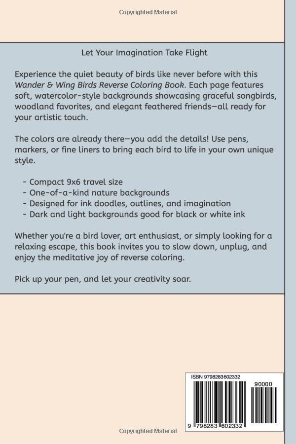 This book is perfect for anyone who finds joy in nature, peace in birdsong, and calm in creative moments. With more than 45 stunningly soft watercolor backgrounds of beautiful birds in flight, perched in gardens, or nestled among branches, you'll discover a gentle and mindful artistic escape that’s perfect for all ages and skill levels.