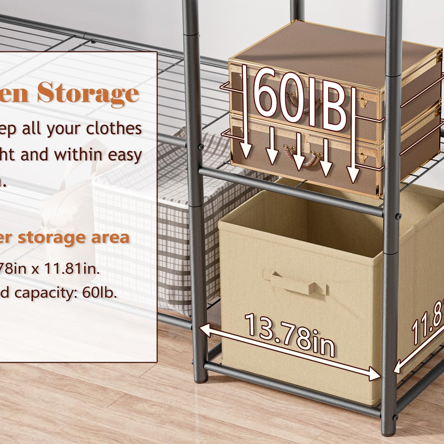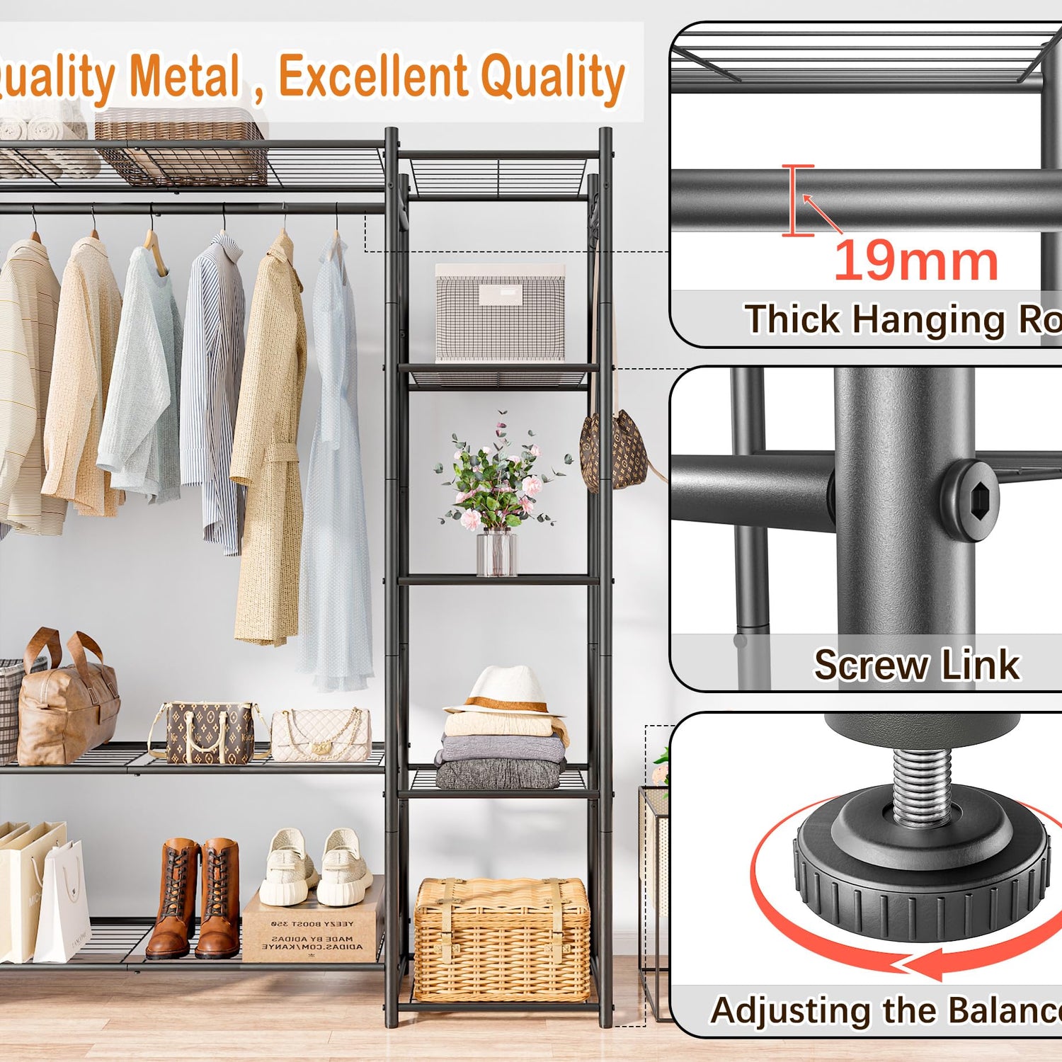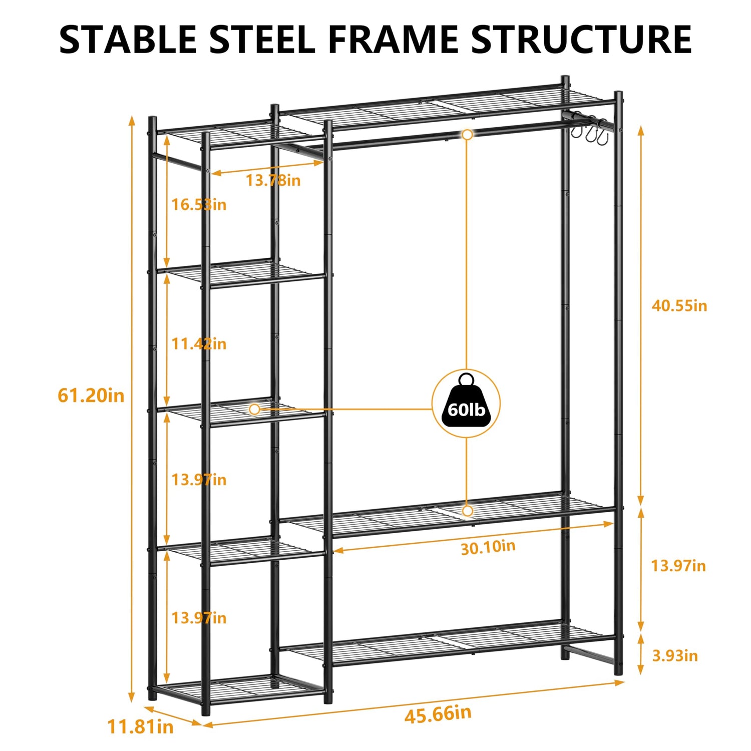 - Sturdy and Durable: The wardrobe organizer measures 45.67*11.81*61.20 inches. This hanger is made of thick metal tubing, ensuring excellent durability. The diameter of each main steel pipe is 16mm, ensuring bending resistance. The wardrobe system uses screw-fastened steel pipes to provide stability and sturdiness. Additionally, adjustable balancing feet enhance stability on any surface. Each storage compartment can hold up to 60 pounds.