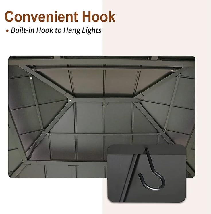 - DUAL RAIL & HOOK DESIGN: Double rail design under roof edge can hang mosquito netting and private curtain at the same time, choose freely. You can also equip lamp or fan with J-shaped hook under roof, making the gazebo suitable for more use scenarios.