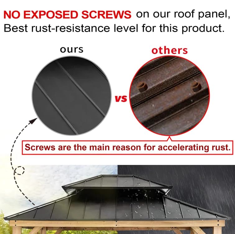 - DOUBLE GALVANIZED STEEL ROOF: The Warmally 11ft x 13ft pavilion has a steel roof that can withstand heavy snow and provides a secure shelter, the double top design provides ventilation. The multiple vertical stripes of the pavilion roof ensure that rain and snow slide off easily and do not cause a build-up problem.