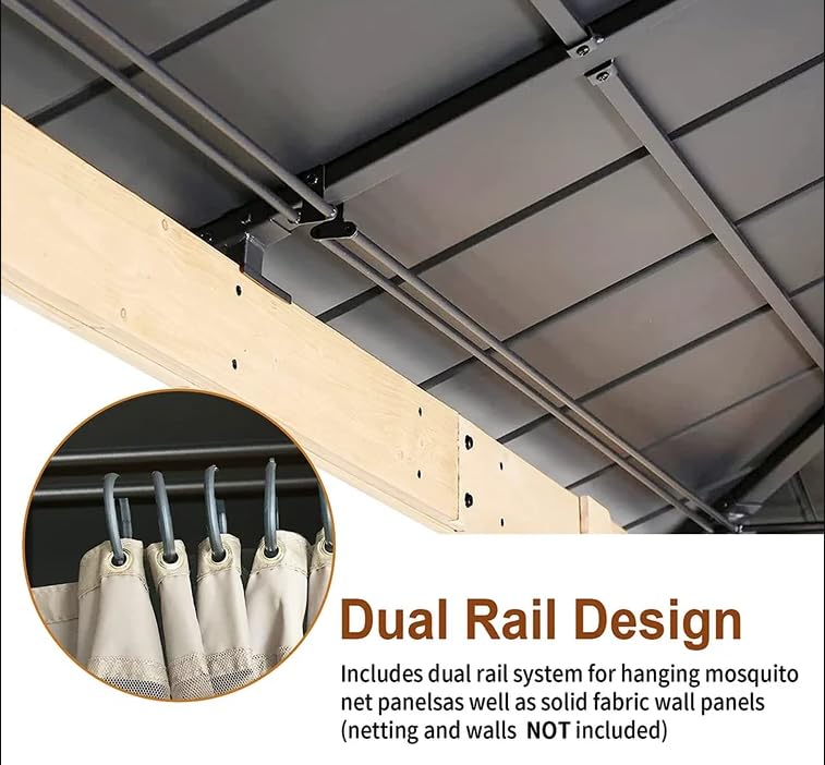 - DUAL RAIL & HOOK DESIGN: Double rail design under roof edge can hang mosquito netting and private curtain at the same time, choose freely. You can also equip lamp or fan with J-shaped hook under roof, making the gazebo suitable for more use scenarios.