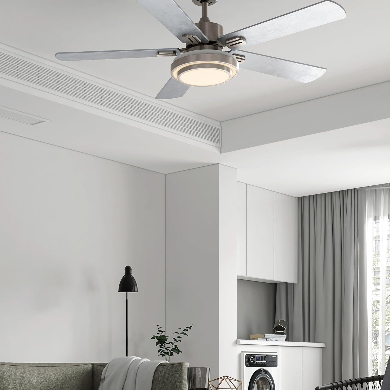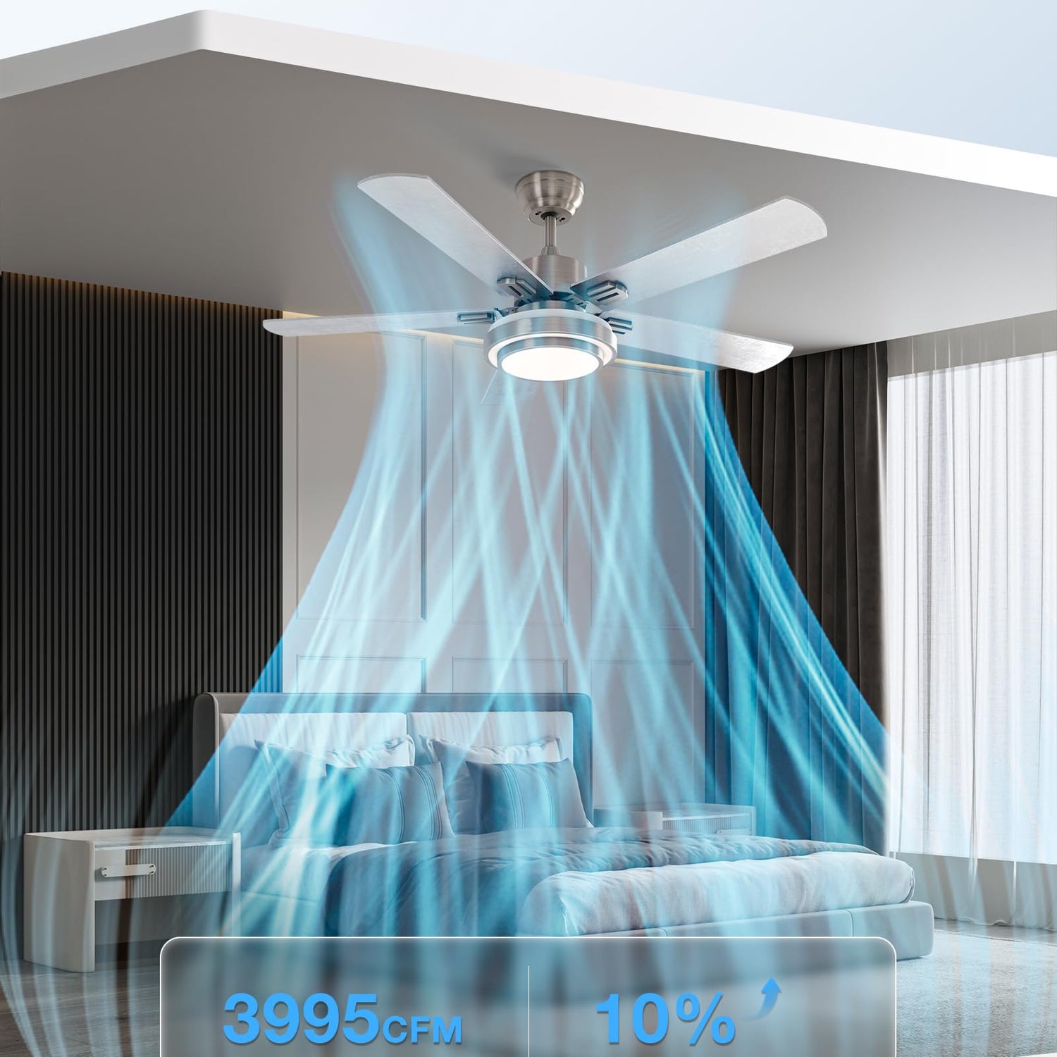 • ✅[Double-faced]: Ceiling fan with remote has double-faced white/silver blades and stylish nickel-plated motor housing.