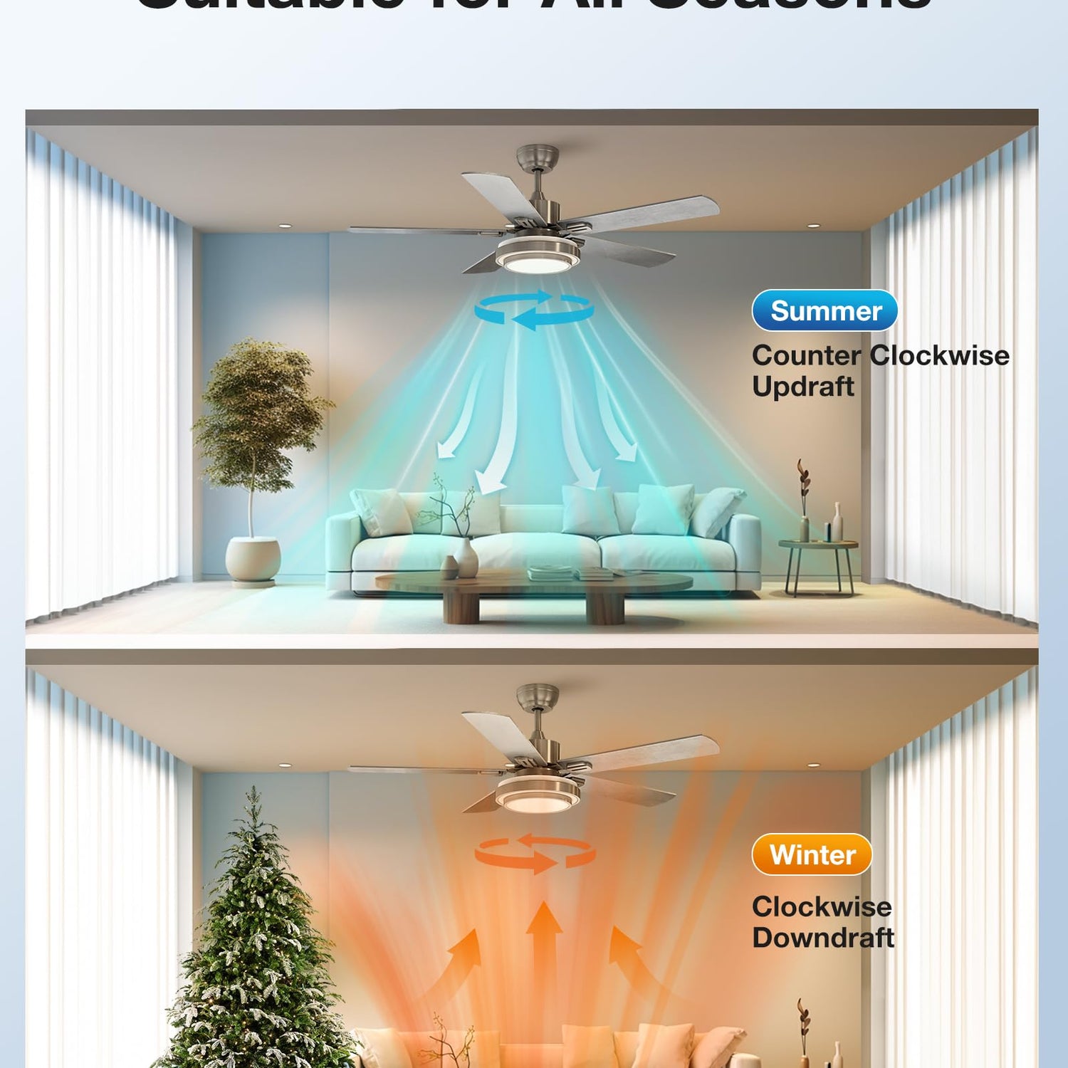 • ✅[Silent Reversible Motor]: By slipping the button on the motor can make downdrafts in summer and make updrafts in winter. Noise of the fan is less than 50 db.The fan also has timing function.