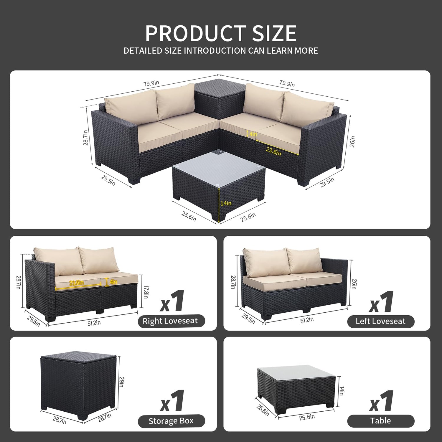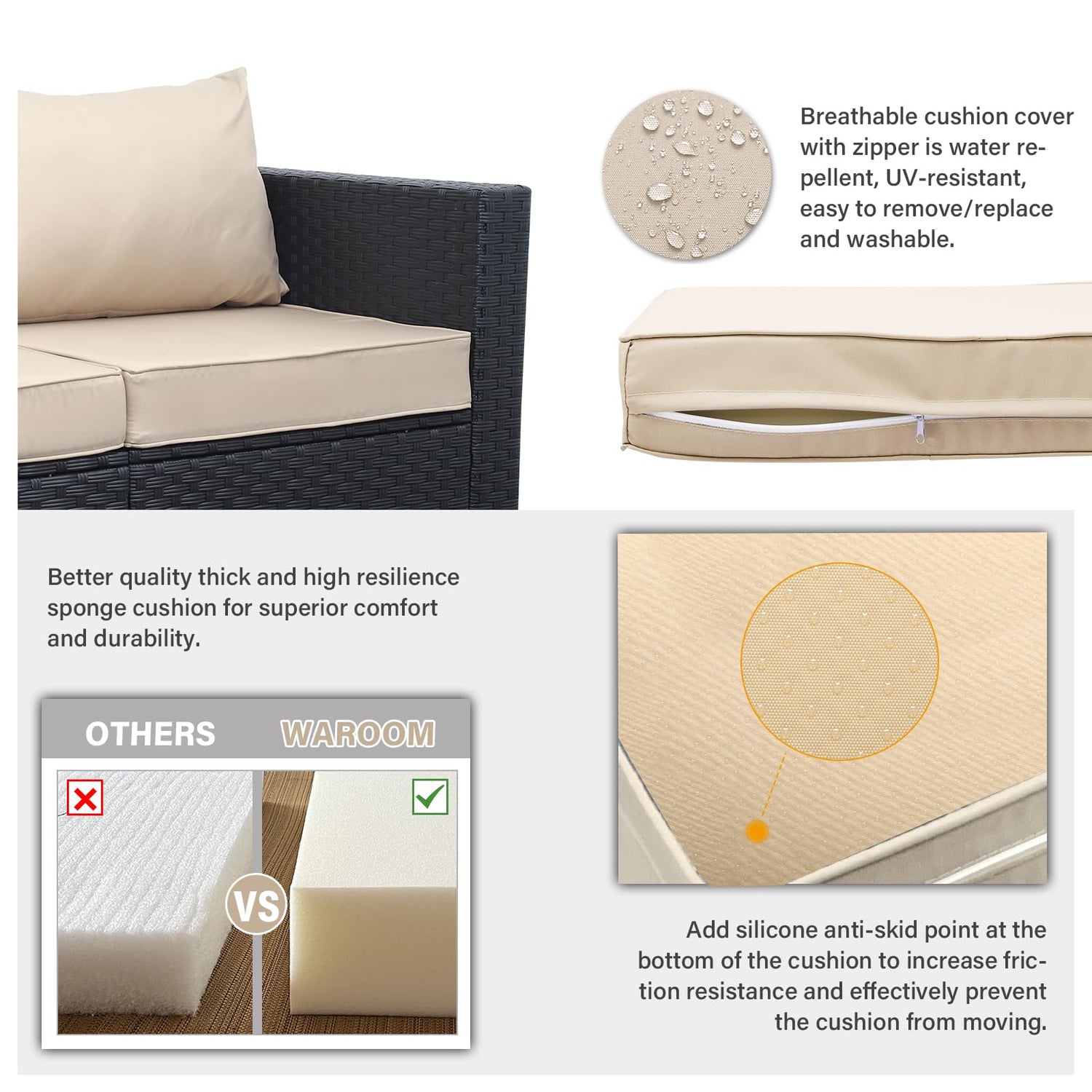WAROOM Outdoor PE Wicker Patio Furniture Set 4 Piece Black Rattan Sectional Sofa Conversation Couch Sets with Storage Box Glass Top Table and Anti-Slip Khaki Cushion
