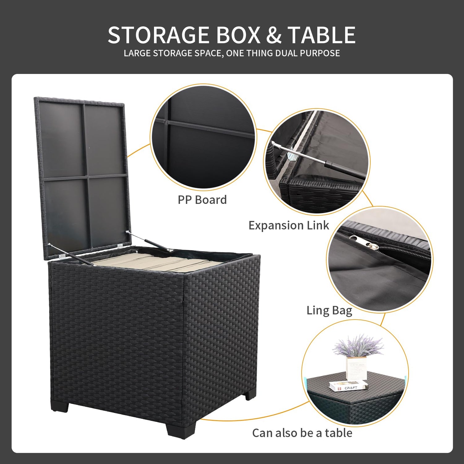 - HIGH QUALITY: The patio storage furniture is constructed from rust-resistant steel frame and all-weather PE rattan, which is sturdy and durable.The non-slip seat cushions filled with 4" thick high resilience sponge for superb comfort and durable, breathable cushion cover with zipper is wear-resistant, water repellent, UV-resistant, and high color fastness.