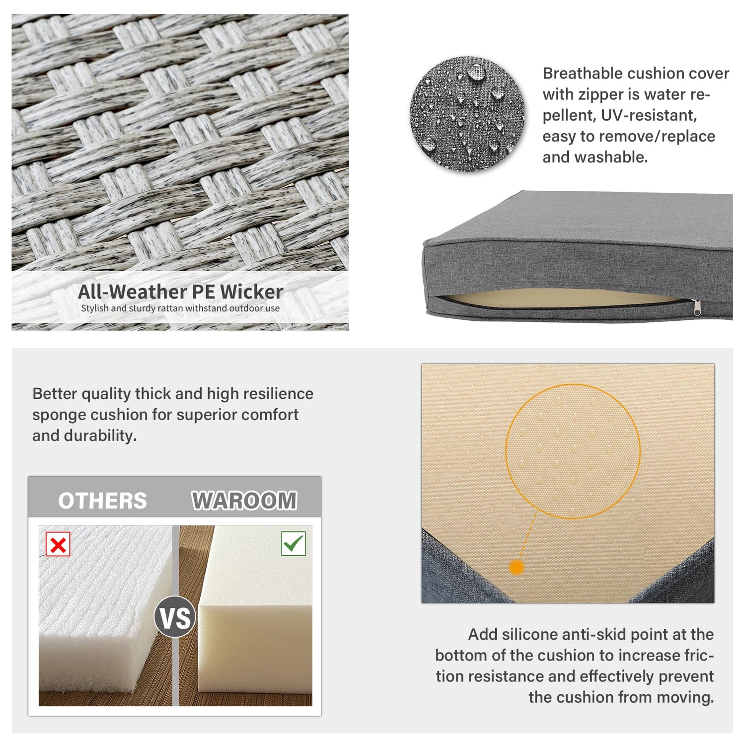 - Comfortable: Each seat features a 4" thick high-resilience sponge cushion that provides exceptional comfort for extended relaxation. Breathable cushion cover with zipper is wear-resistant, water-repellent, UV-resistant, and high color fastness