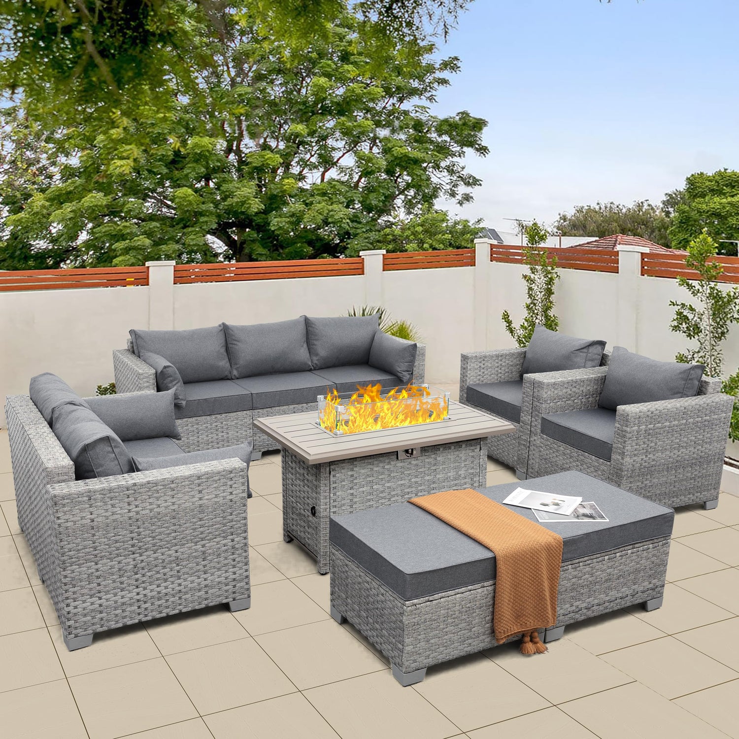 WAROOM Patio Furniture Set Gray Rattan 7 Pieces Outdoor Sectional Sofa PE Wicker Conversation Chairs with Propane Fire Pit Table and Non-Slip Thick Grey Cushion