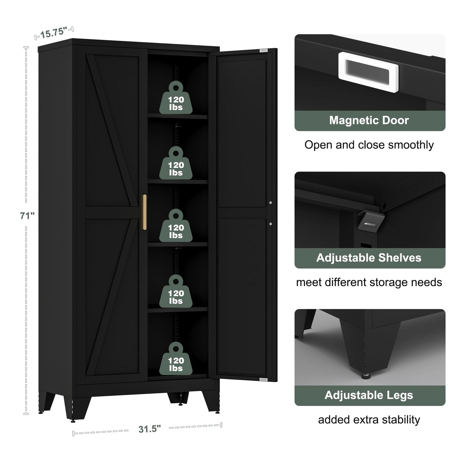 Washsemba 71'' Farmhouse Metal Storage Cabinet with Barn Doors,Steel File Cabinet for Home Office,Kitchen Pantry 4 Adjustable Shelves,Freestanding Cupboard for Kitchen,Home Office (Black)