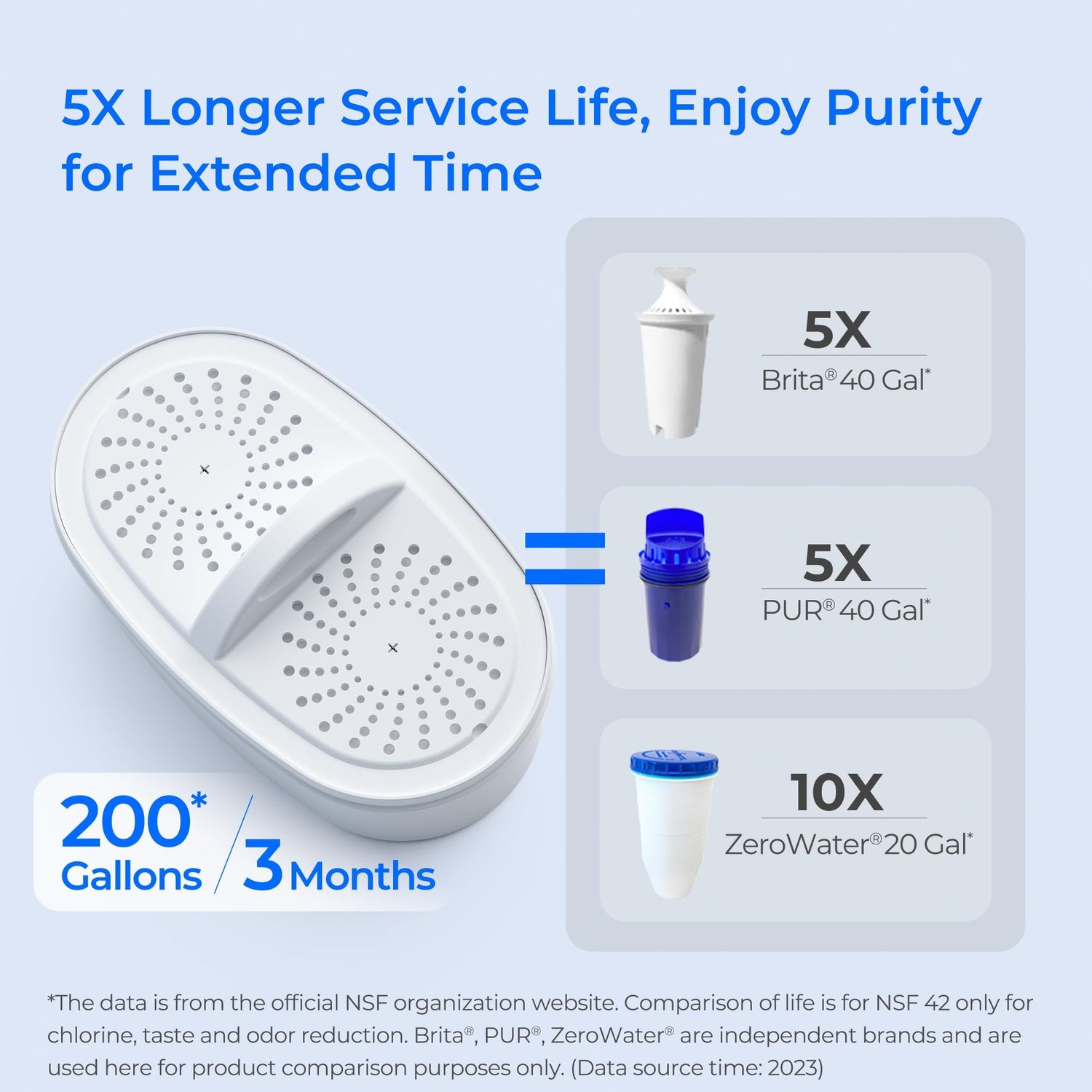 - 5x Longer Lifespan: The filtered water pitcher has a filter lifespan of up to 200 gallons or 3 months. You can purify your drinking water for a longer time. The flow rate helps increase filtration efficiency of clean drinking water.