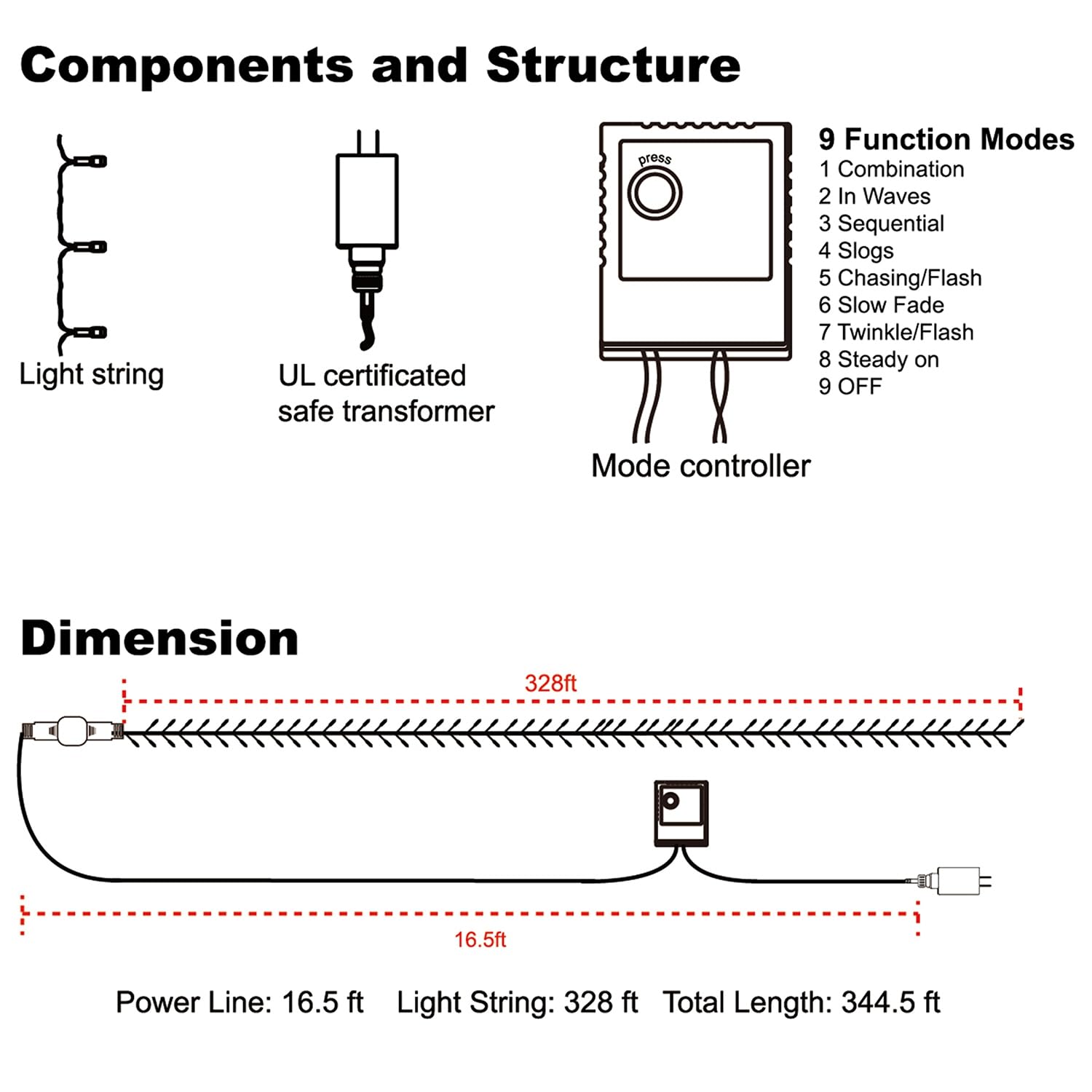 - 1000 LED Christmas Lights: Decorate with our 328ft Christmas warm white string lights with green wire, creates a warm festive atmosphere, surely lights up your room and house. A warm welcome sign at night to make your home a wonderful sight for your neighbors! US standard outlet, voltage 110V. Adapter to the first LED light: 16.5ft. Total length (include leading line): 344.5ft