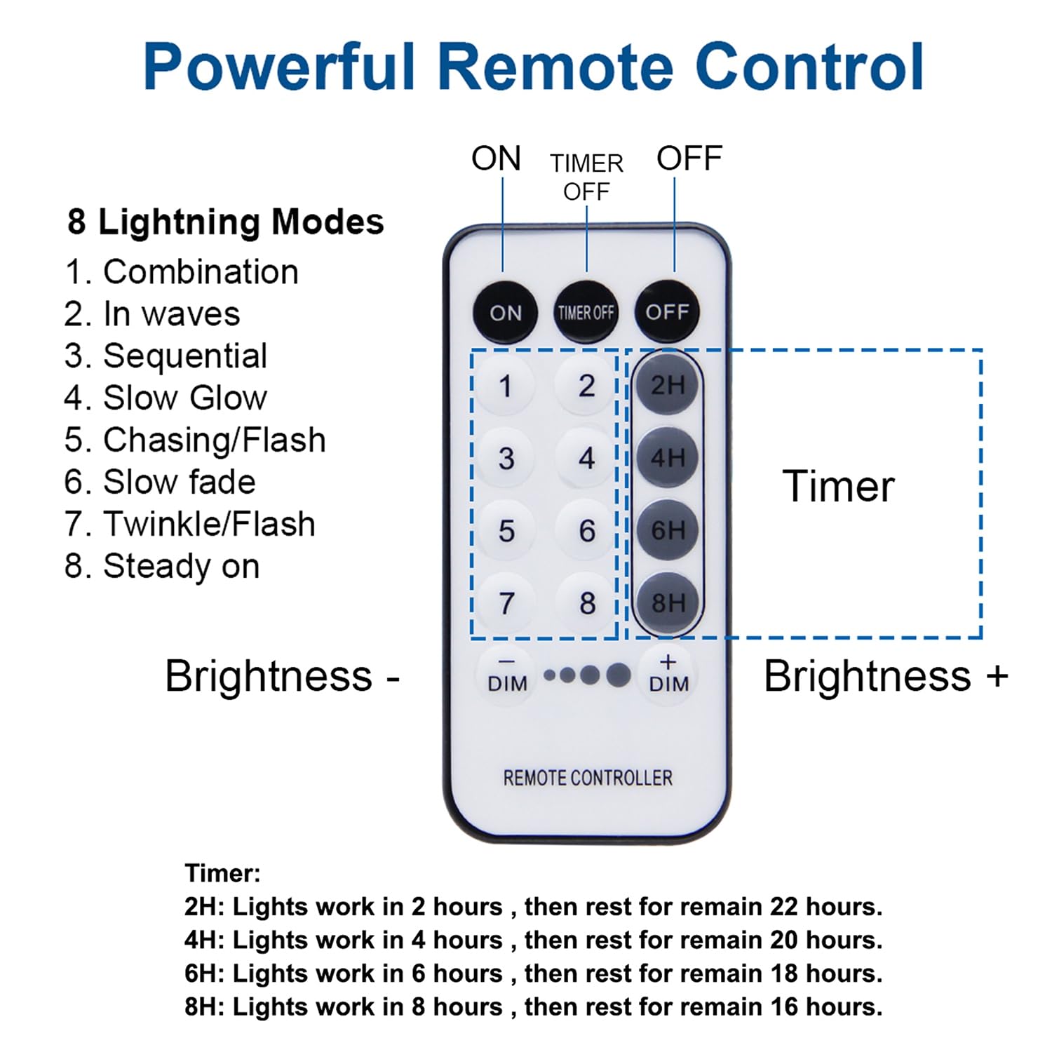 - 8 Lighting Modes: This holiday decorative string light has 8 lighting modes for you to choose: combination, in waves, sequential, slogs, chasing/flash, slow fade, twinkle/flash, and steady on. Fit different occasions and environment, adjust the lighting modes by using remote control or pressing the round button on the black mode controller box