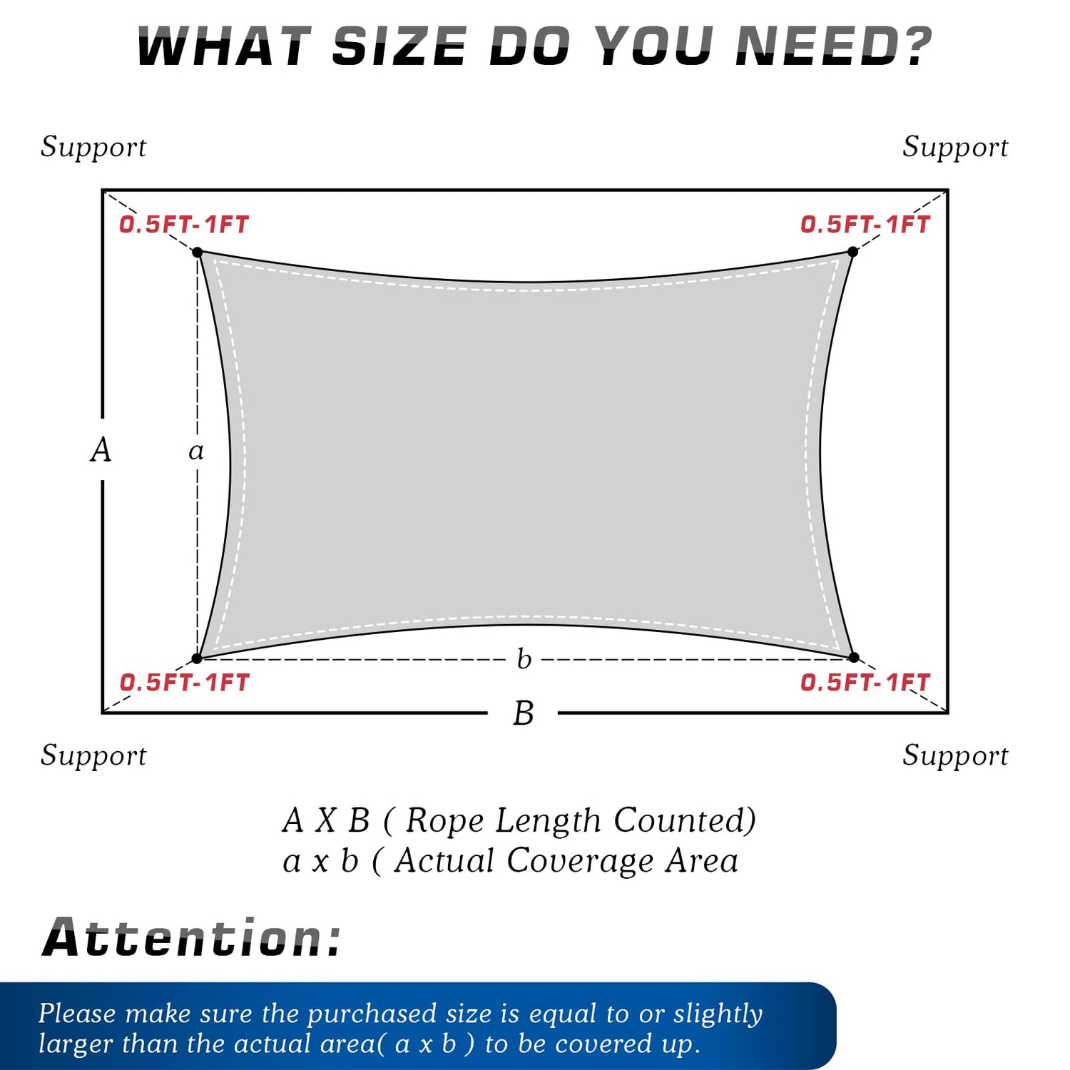 • 【TIPS FOR INSTALLATION】- To avoid water from being collected in the center, please make sure the rectangular sail shade is mounted at a 30 degree angle to allow raindrop to run away.