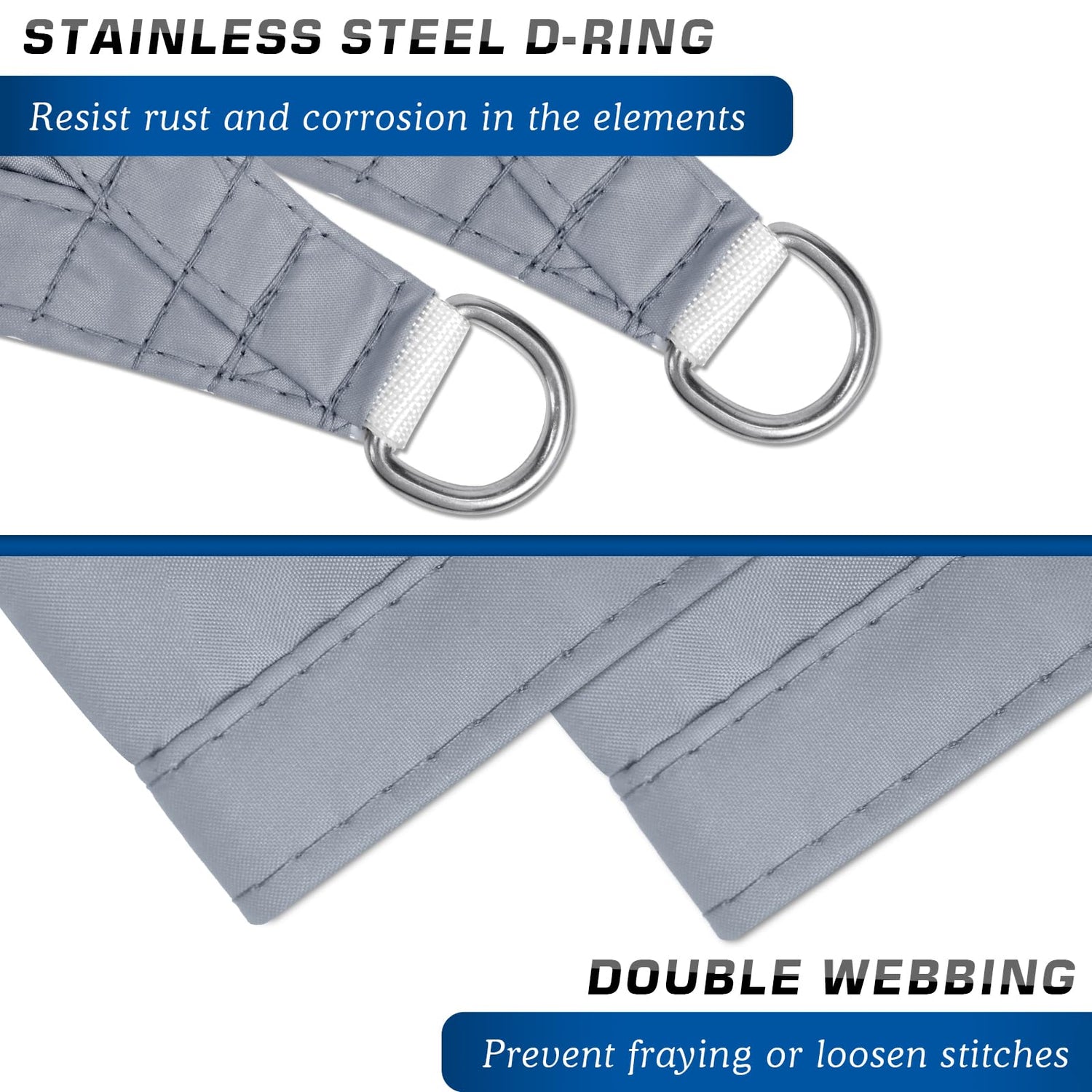 • 【HEAVY-DUTY, WEATHERPROOF HARDWARE】- This sun shade canopy is attached to the posts through ropes and steel stainless D rings that withstand weather elements. Reinforced webbing does not fray or deform easily.